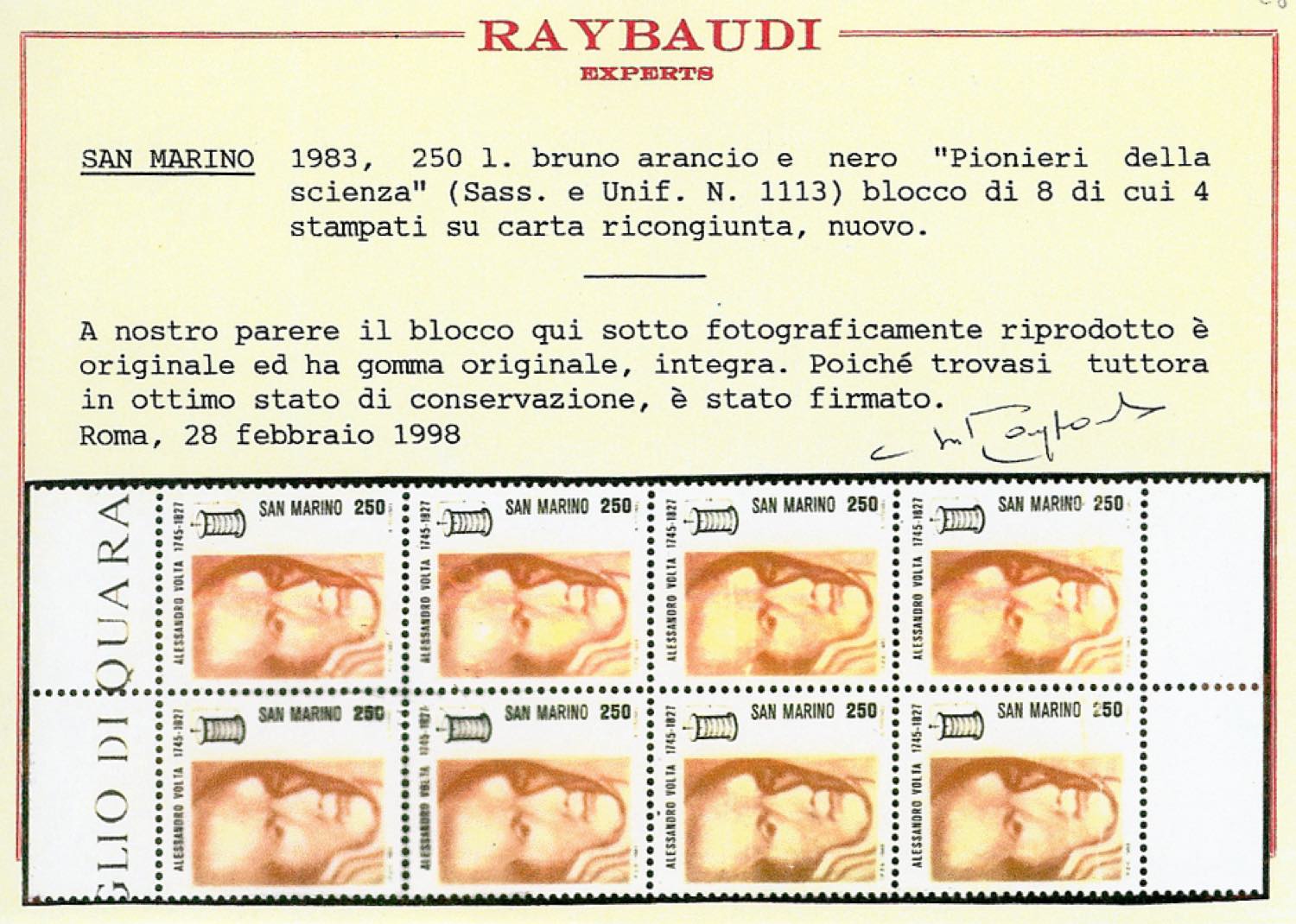 1983 - 250 lire Scienza - Volta, striscia verticale di quattro, due esemplari stampati su carta ricongiunta (1113a), gomma integra, perfetta. Molto rara! Fotocopia cert. Raybaudi del blocco di provenienza.