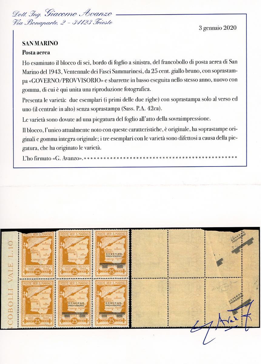 1943 - 25 cent. soprastampato "Governo Provvisorio", blocco di sei, due esemplari con la soprastampa solo al verso, uno senza soprastampa, a causa di una piegatura del foglio al momento della sovraimpressione (42ca), bordo di foglio, gomma originale integra. Da notare che in tale blocco si crea una coppia tra il francobollo non emesso ed uno soprastampato. INSIEME UNICO, RARITA' DEL SETTORE. Cert. Avanzo e Ferrario.
