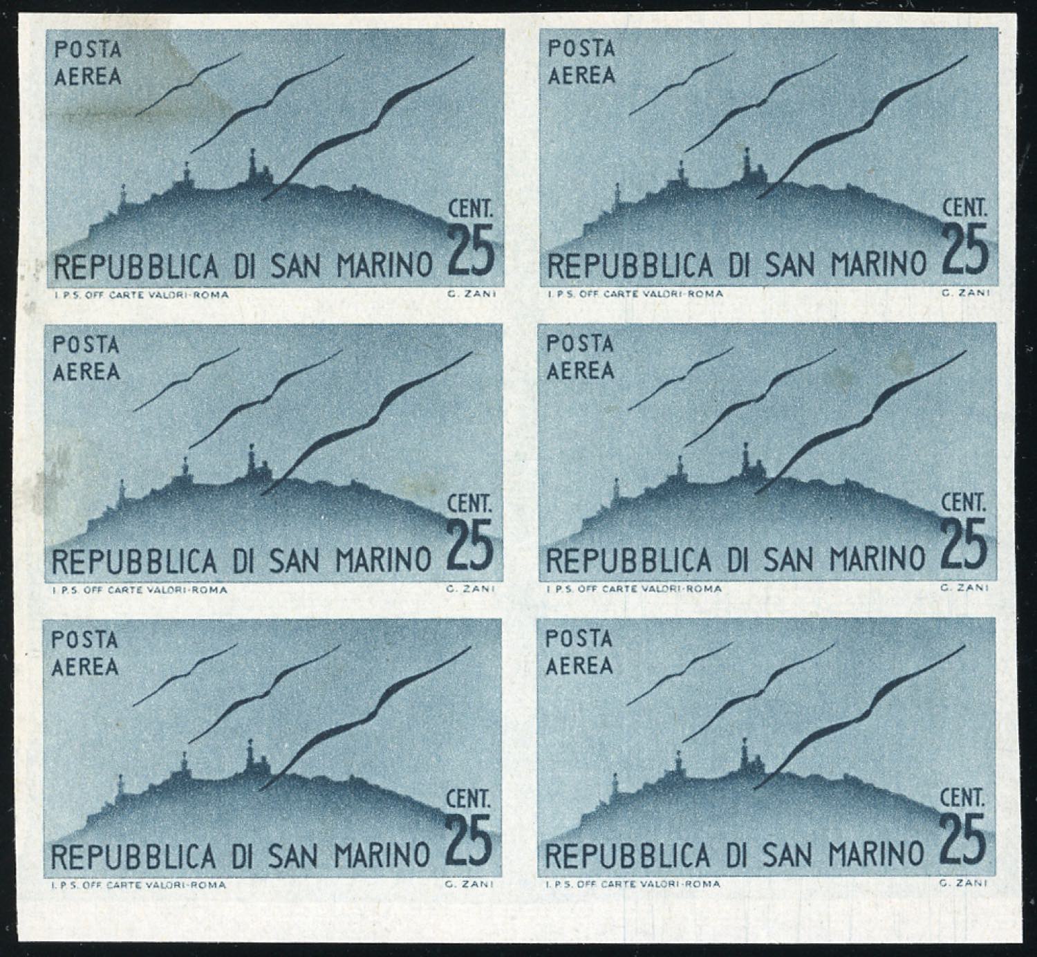 1946 - 25 cent. Vedute, non dentellato (50b), blocco di sei, gomma originale integra, perfetto. Ferrario.