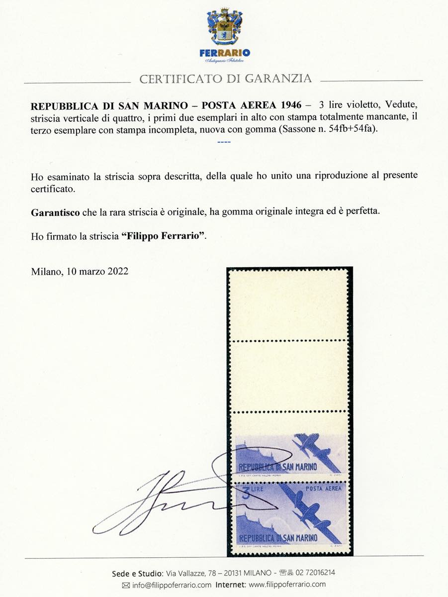 1946 - 3 lire Vedute, striscia verticale di quattro, i primi due esemplari con stampa totalmente mancante, il terzo con stampa incompleta (54fb+54fa), gomma originale integra, perfetta. Splendida e molto rara. E.Diena, cert. Ferrario.