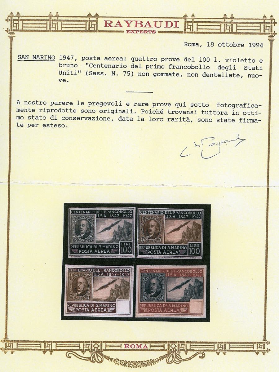 1947 - 100 lire Centenario francobollo Stati Uniti (75), prova in colori non adottati, non dentellata, senza gomma, perfetta. Rarissima. ... Leggi tutto