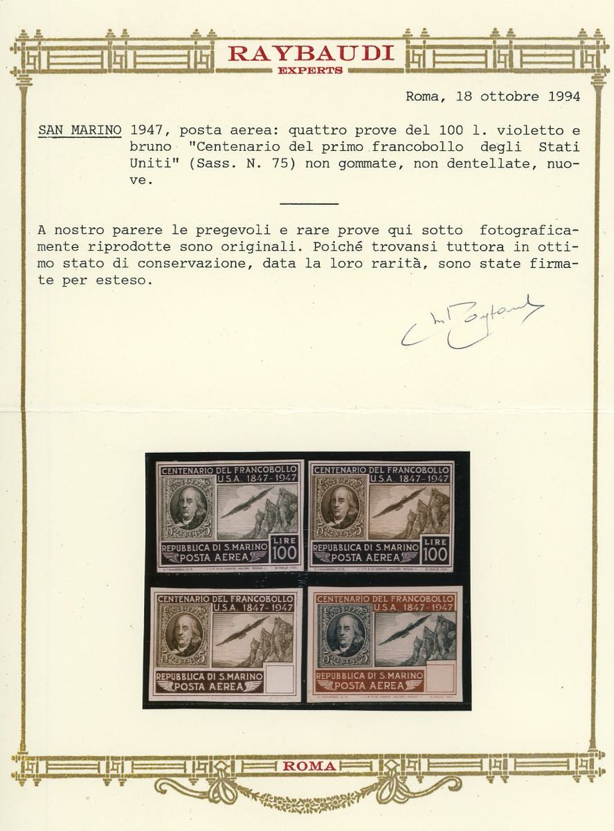 1947 - 100 lire Centenario francobollo Stati Uniti (75), prova in colori non adottati, senza l'indicazione del valore, non dentellata, senza gomma, perfetta. Rarissima. Cert. Oro Raybaudi.