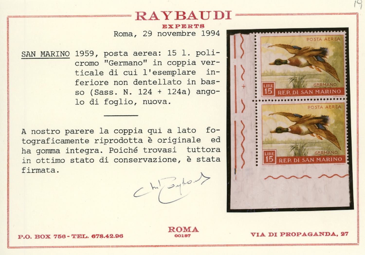 1959 - 15 lire Uccelli, non dentellato in basso, in coppia con il normale (124a), angolo di foglio, gomma originale integra, perfetta. Splendida! Cert. Raybaudi.
