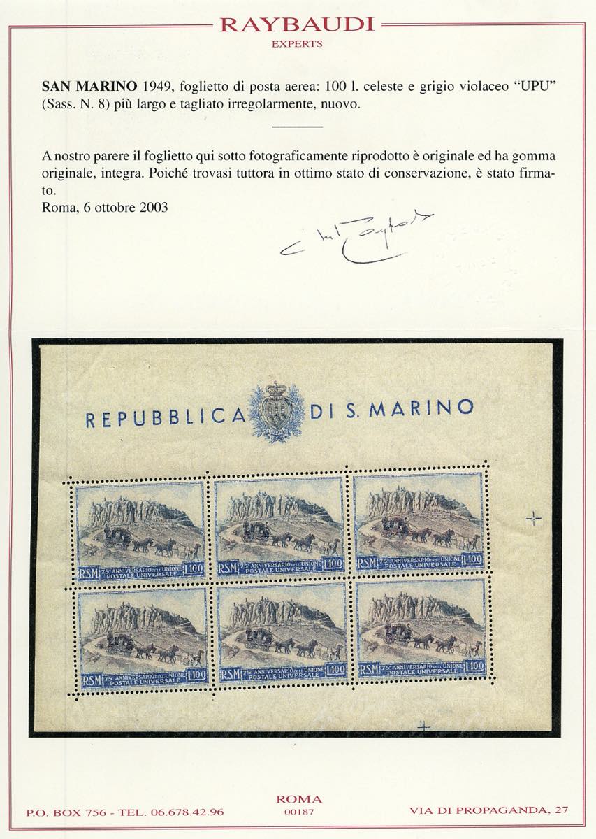 1949 - 100 lire UPU, foglietto, taglio irregolare e più largo orizzontalmente (8), gomma originale integra, perfetto. Sirotti, cert. ... Leggi tutto