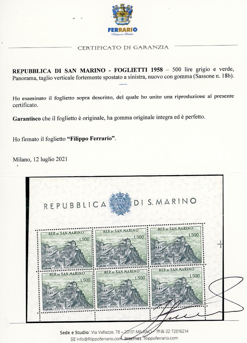 1958 - 500 lire Panorama, foglietto, taglio verticale fortemente spostato a sinistra (18b), gomma integra, perfetto. Cert. Ferrario.