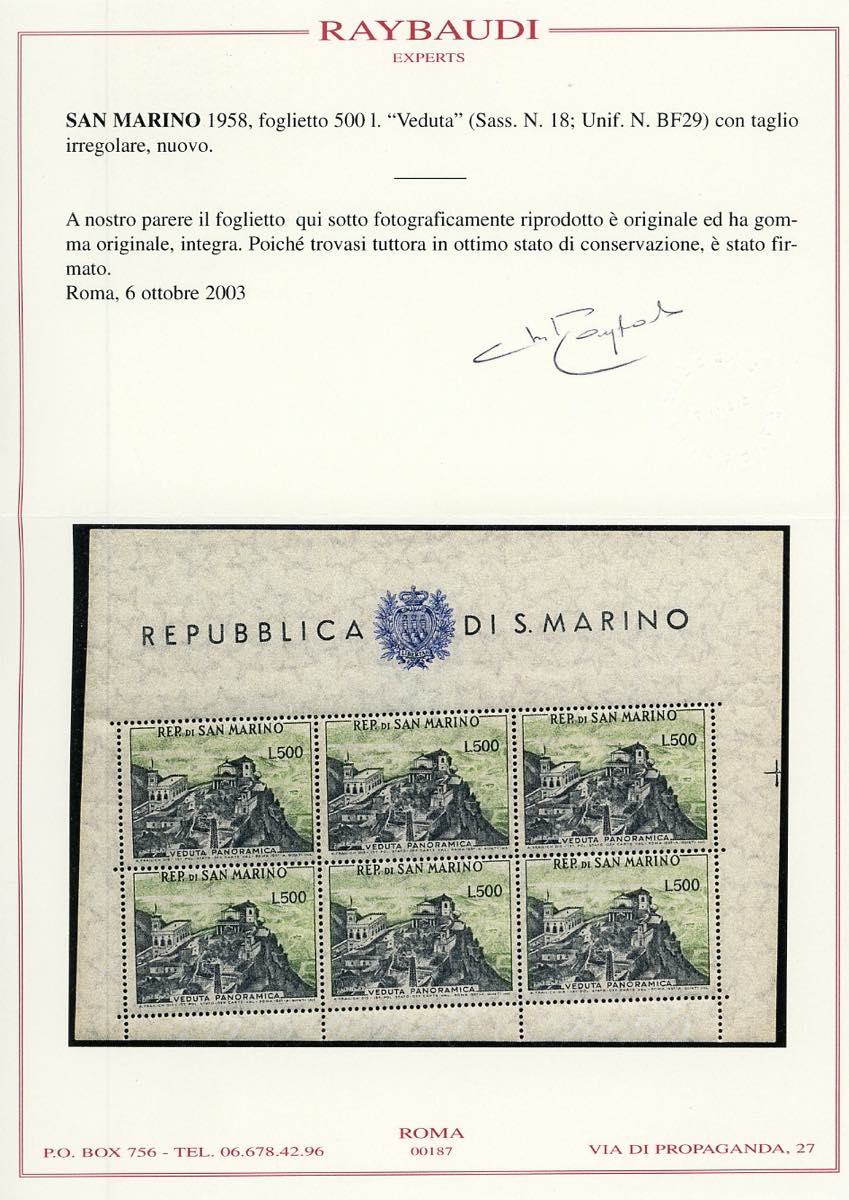 1958 - 500 lire Panorama, foglietto, taglio verticale fortemente spostato a sinistra (18b), gomma originale integra, perfetto. Cert. Raybaudi.