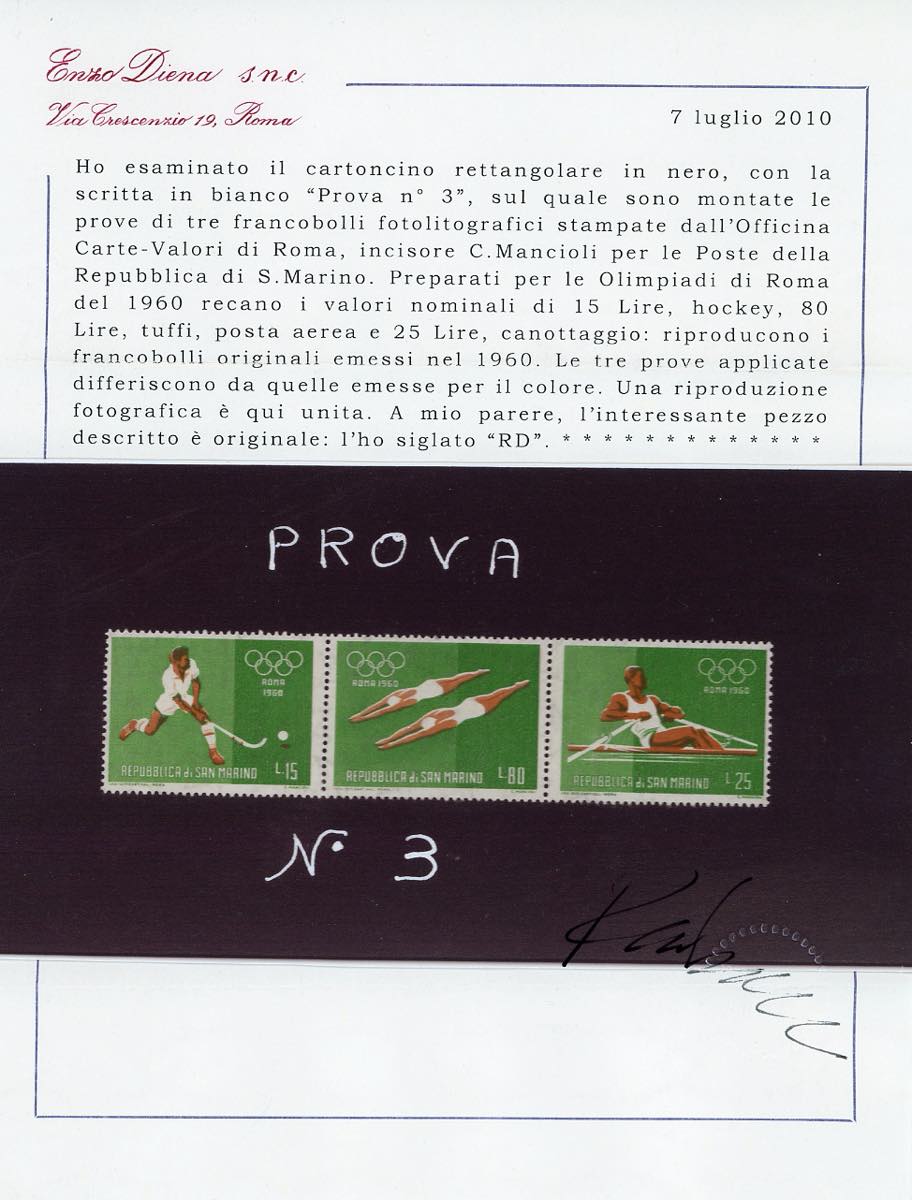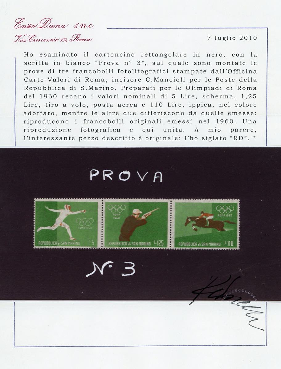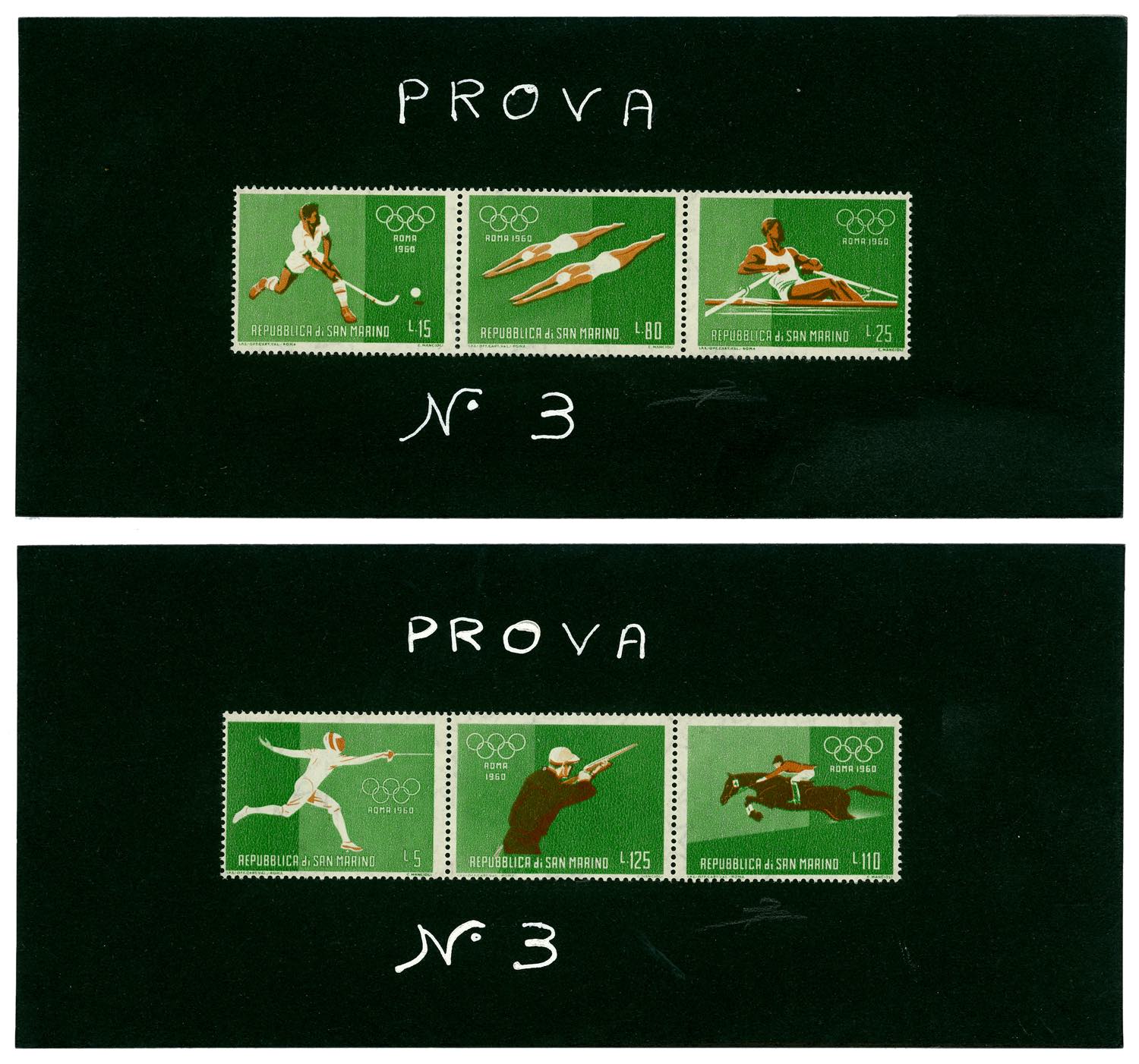 1960 - Giochi Olimpici di Roma, foglietto (21), due cartoncini neri, cm 19,5x9, con dicitura manoscritta "Prova n. 3", il primo con i francobolli da 15, 80 e 25 lire, il secondo da 5, 125 e 110 lire, provenienti dal foglietto, tutti dentellati, perfetti. Si tratta degli UNICI ESEMPLARI NOTI DENTELLATI di questi francobolli, dal momento che i foglietti erano non dentellati. Rarità del settore. Cert. Diena.