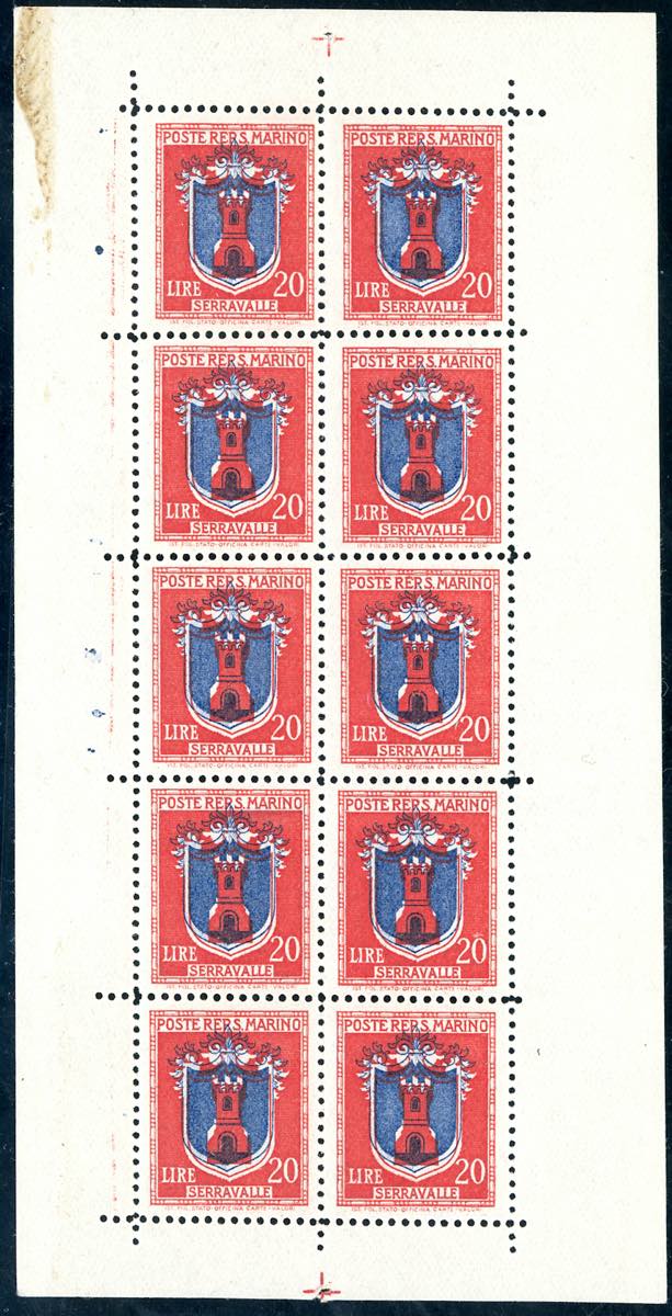 1945 - 20 lire Stemmi, minifoglio, tutti gli esemplari con la stampa dell'azzurro fortemente spostata in alto (2,292ga), gomma originale ... Leggi tutto