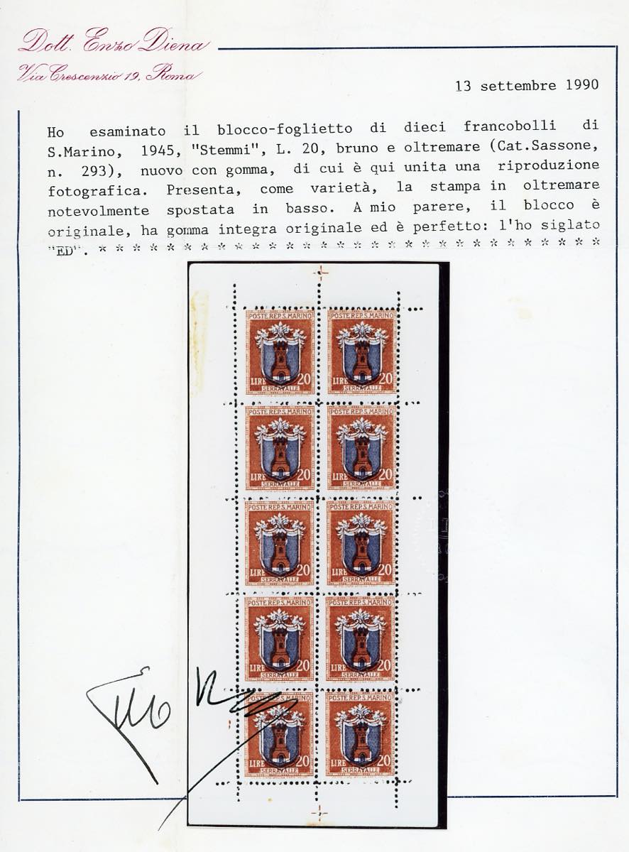 1945 - 20 lire Stemmi, minifoglio, tutti gli esemplari con la stampa dell'azzurro fortemente spostato in basso (3ac), gomma originale integra, perfetto. Cert. E.Diena.
