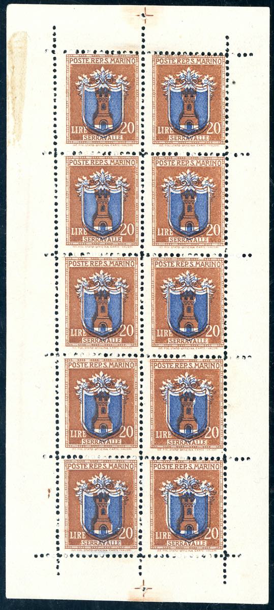 1945 - 20 lire Stemmi, minifoglio, tutti gli esemplari con la stampa dell'azzurro fortemente spostato in basso (3ac), gomma originale ... Leggi tutto