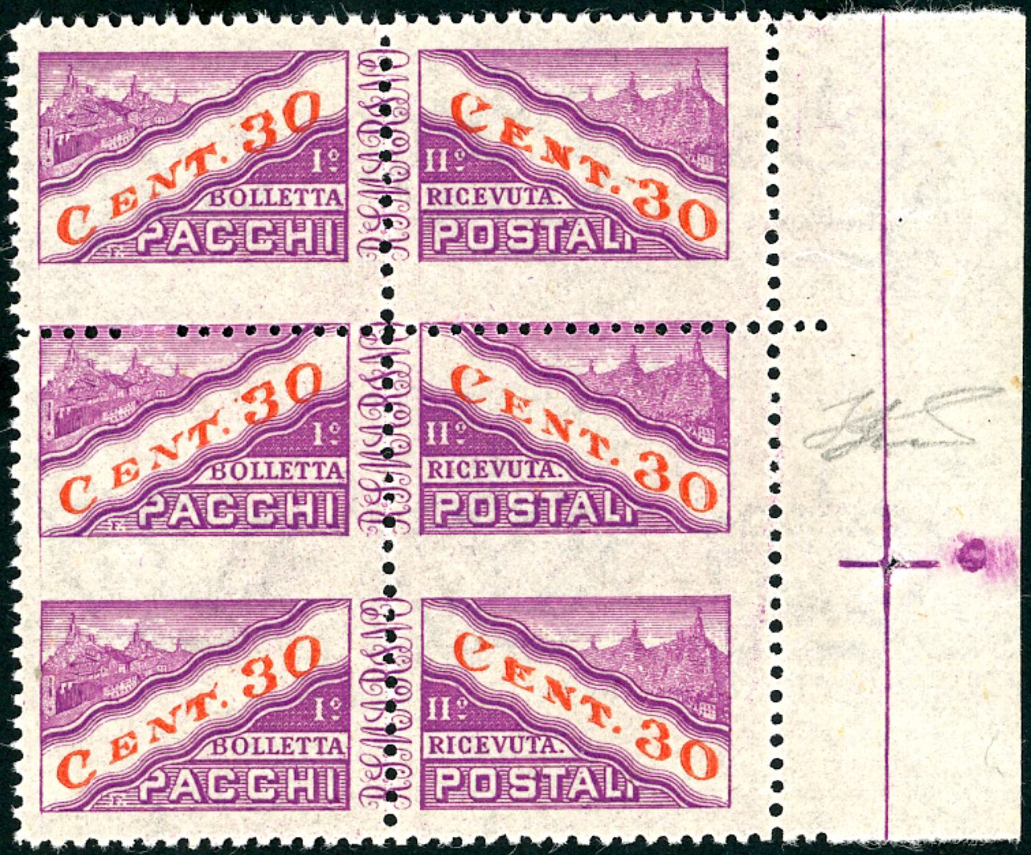 1946 - 30 cent., filigrana dritta, striscia verticale di tre, la coppia inferiore non dentellata al centro (20/If), bordo di foglio, gomma ... Leggi tutto