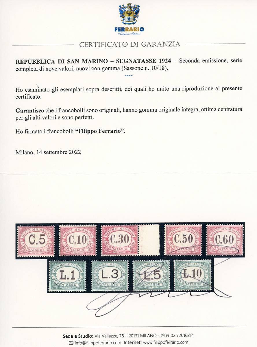 1924 - Colori cambiati, serie completa (10/18), ottima centratura per gli alti valori, gomma originale integra, perfetti. Molto belli, qualità lusso. 10 lire Caffaz e cert. Diena, tutti cert. Ferrario.