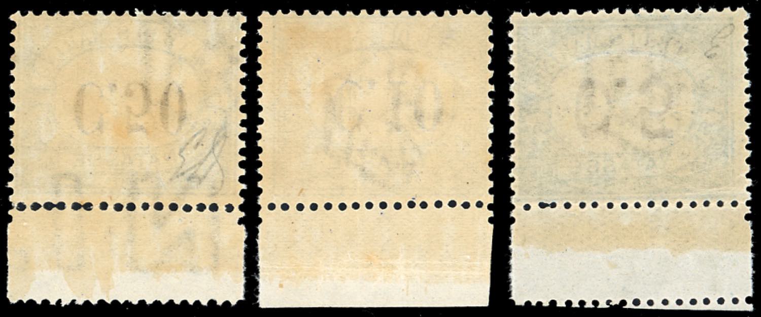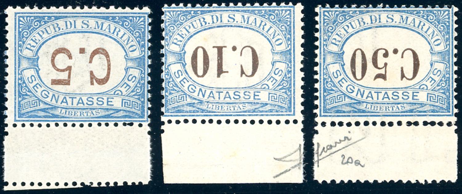1925 - 5 cent, 10 cent, 50 cent, cifre capovolte (19a,20a,22a), bordo di foglio, gomma integra, perfetti. Rari, tiratura 100 esemplari per ciascun valore. Sorani.