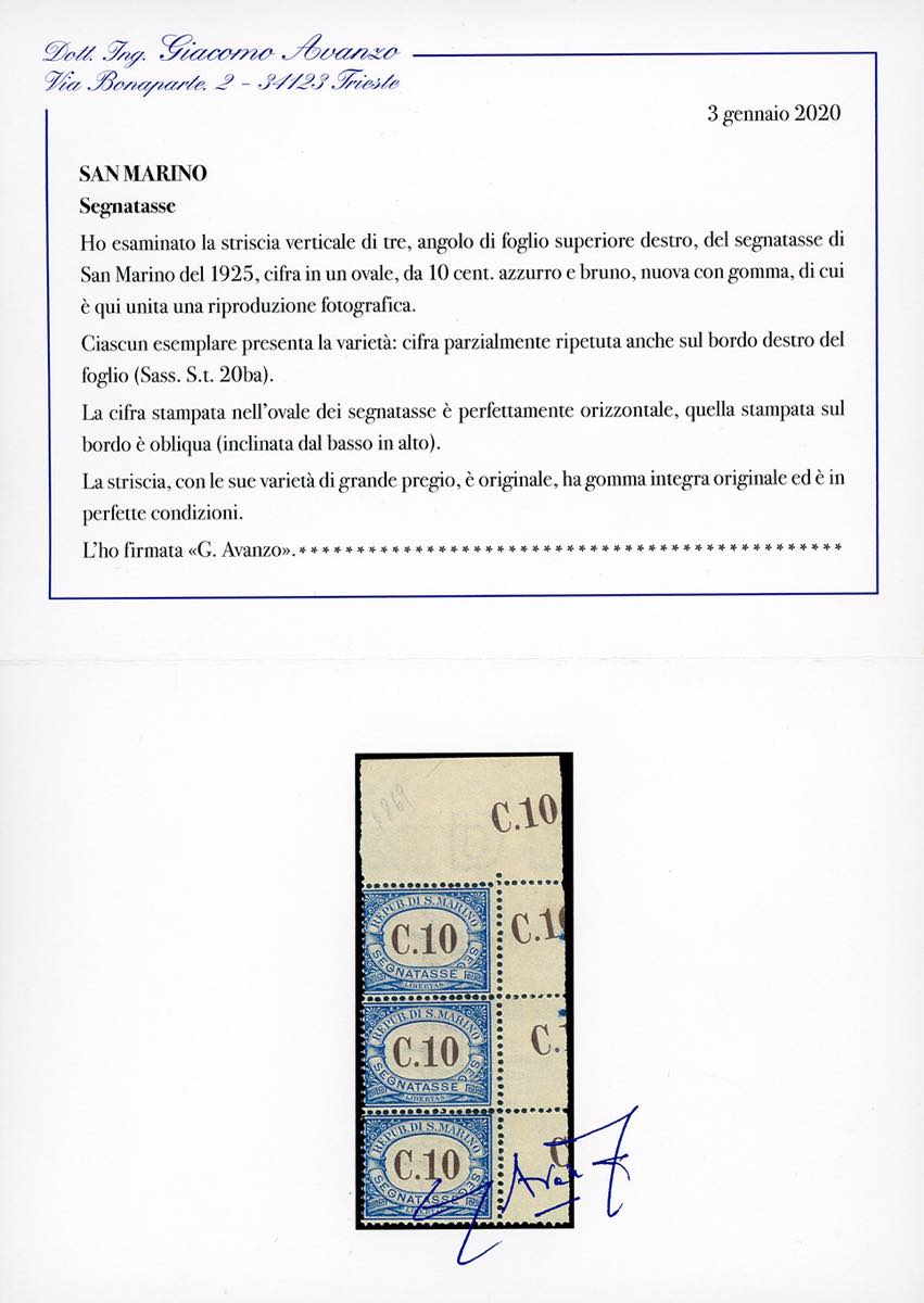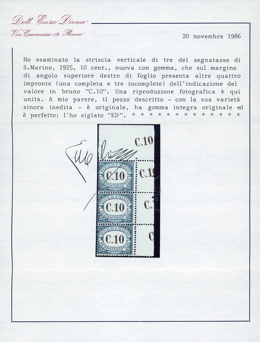 1925 - 10 cent., striscia verticale di tre, angolo di foglio, cifra parzialmente ripetuta anche sul bordo destro (20ba), gomma originale integra, perfetta. Rara varietà. Cert. E.Diena e Avanzo.