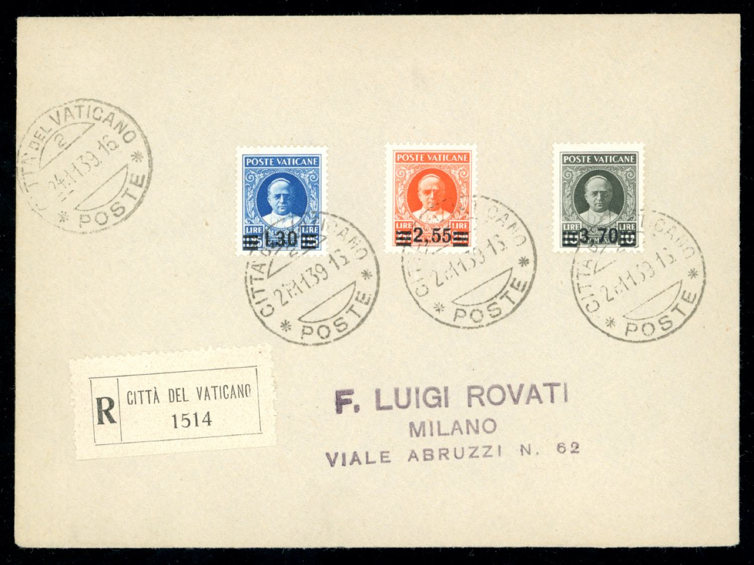 1939 - Provvisoria, serie completa (35/40), perfetti, su due buste raccomandate da Città del Vaticano 24/11/1939 a Milano, bollo di arrivo.