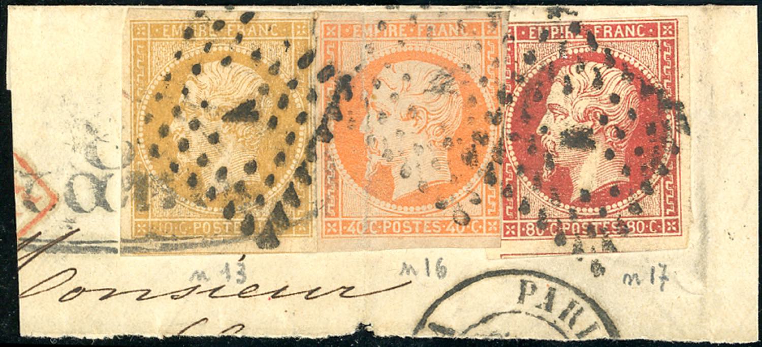 FRANCIA 1853 - 10 cent., 40 cent., 1 franco Napoleone Imperatore (13,16,17), usati su piccolo frammento, piega orizzontale sul 40 cent. ... Leggi tutto