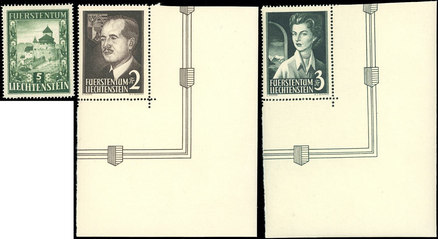 LIECHTENSTEIN 1952/55 - 5 f. Castello di Vaduz, 2 f. e 3 f. Principi, ampio angolo di foglio (272,294/295), gomma integra, perfetti.