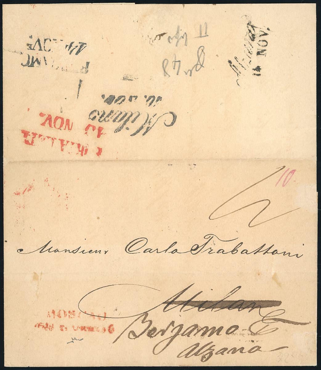 LOMBARDO VENETO-RUSSIA/IMPERO RUSSO 1848 - Lettera prefilatelica da Mosca a Milano 10/11/1848, rispedita ad Alzano, tassata 12 carantani. Rara. Chiavarello. Ex coll. Imperato.