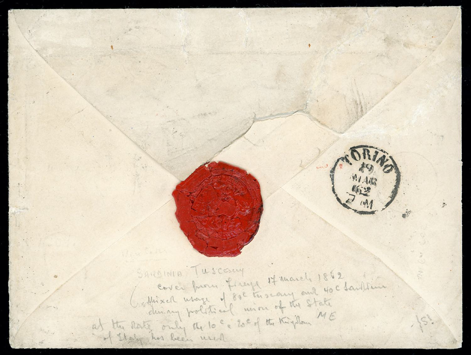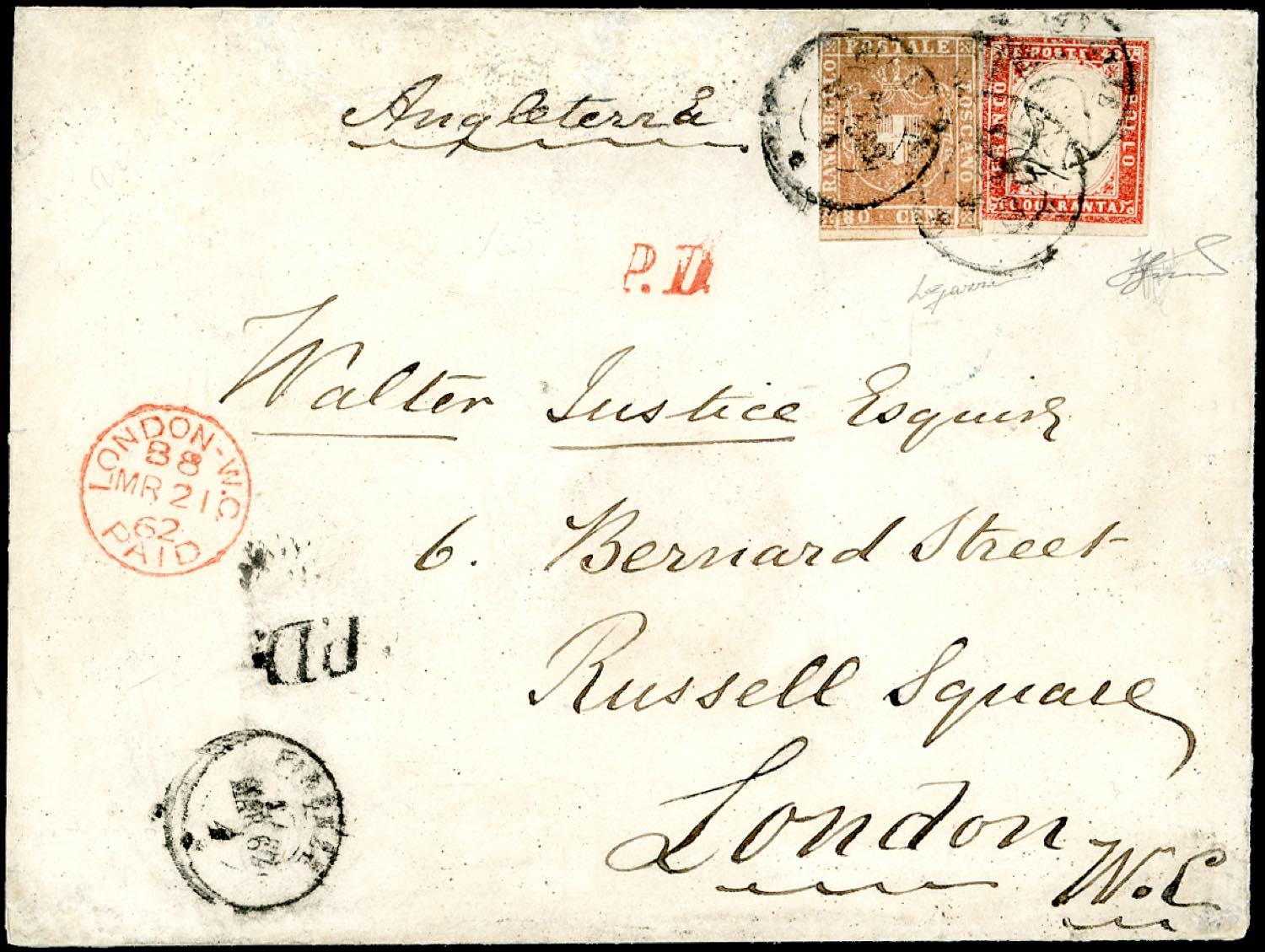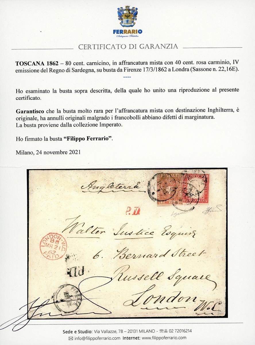 TOSCANA GOVERNO PROVVISORIO-INGHILTERRA 1862 - 80 cent. carnicino (22), in affrancatura mista con 40 cent. rosa carminio IV emissione di Sardegna (16E), lievi difetti di marginatura, su busta da Firenze 17/3/1862 a Londra. Rara affrancatura mista con l'alto valore, impreziosita dall'uso nel 1862 e dalla destinazione estera. L.Gazzi, cert. Ferrario. Ex coll. Imperato.
