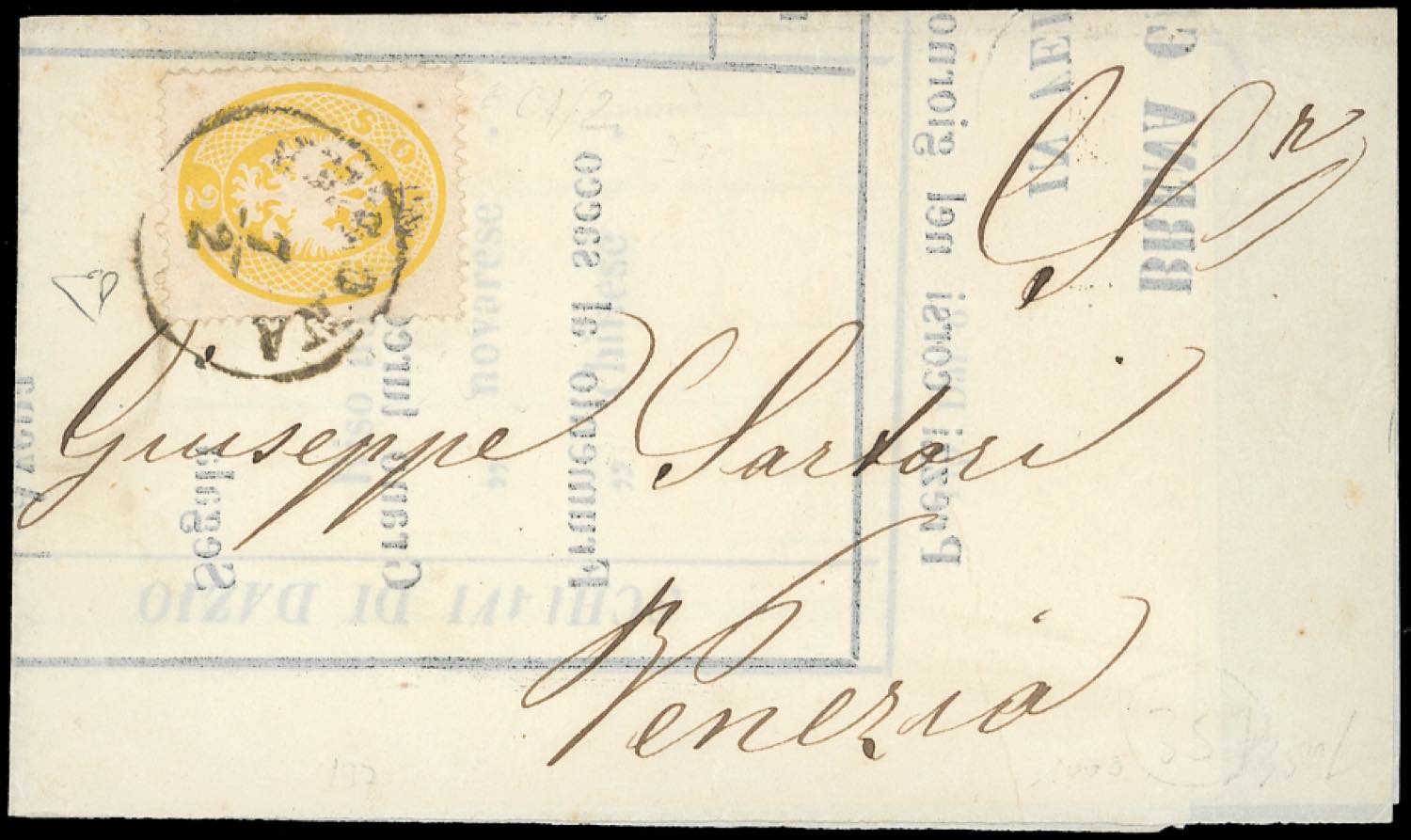 1865 - 2 soldi giallo, dent. 14 (36), perfetto, isolato su listino prezzi a stampa da Verona 7/2/1865 a Venezia. E.Diena.