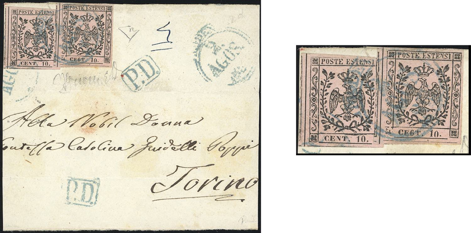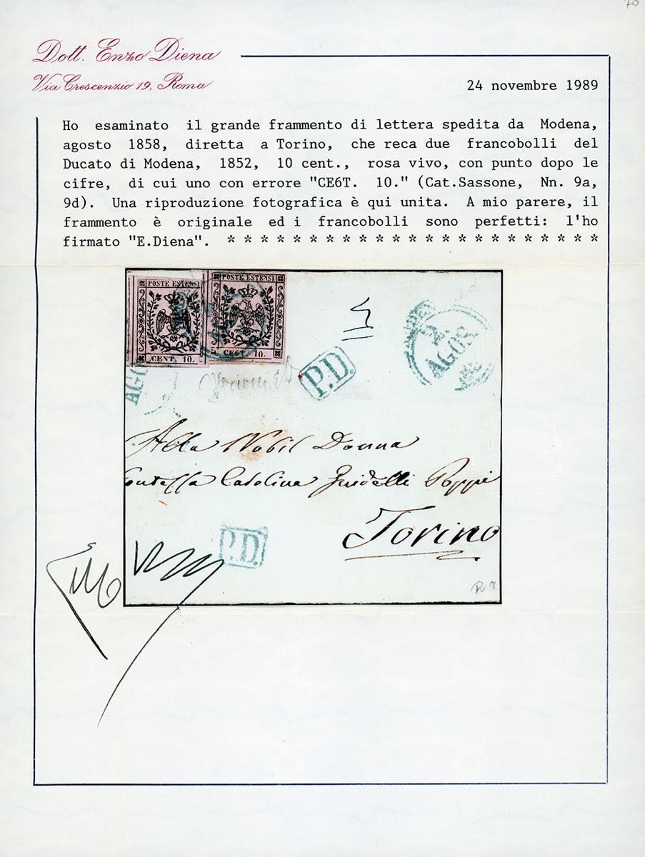 1858 - 10 cent. rosa vivo, punto dopo le cifre, due esemplari, uno con errore tipografico "CE6T" (9d,9a), perfetti, su frontespizio di lettera da Modena 2/8/2858 a Torino. Bella combinazione di francobolli con varietà e senza. Grioni, Em. Diena, cert. E.Diena.
