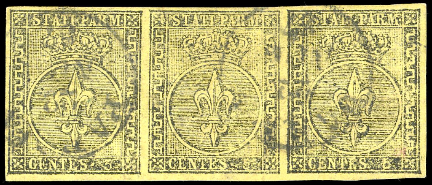 Lotto 185 - 1852 - 5 cent. giallo arancio (1), striscia orizzontale di ...