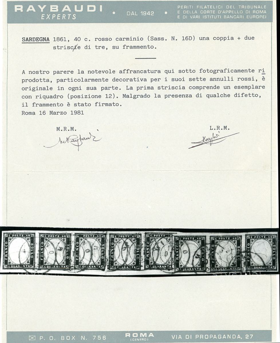 1863 - 40 cent. rosso carminio (16D), una coppia e due strisce di tre, una delle quali comprendente un esemplare con linee di riquadro sui quattro lati, difetti, usata a Milano 14/10/1863 con annullo rosso. Ottimo aspetto, rara affrancatura di grande effetto. A.Diena, cert. Raybaudi.