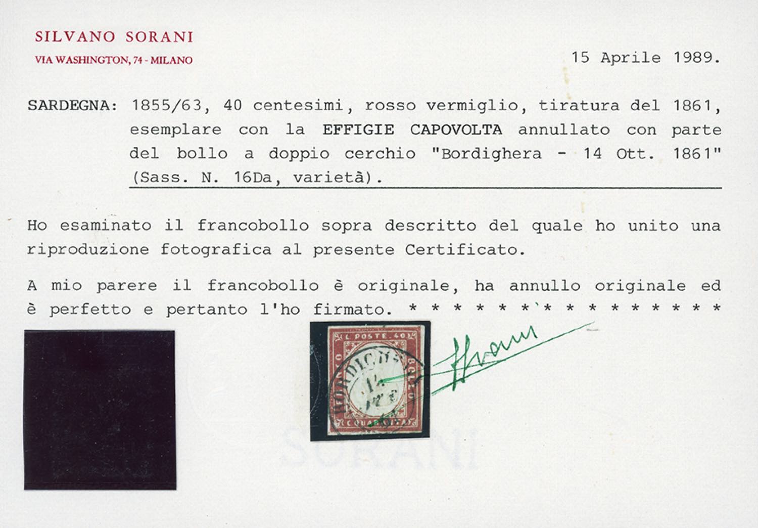 1861 - 40 cent. rosso vermiglio, EFFIGIE CAPOVOLTA (16Da), usato a Bordighera 14/10/1861, perfetto. Molto fresco e raro! A.Diena, cert. Sorani.