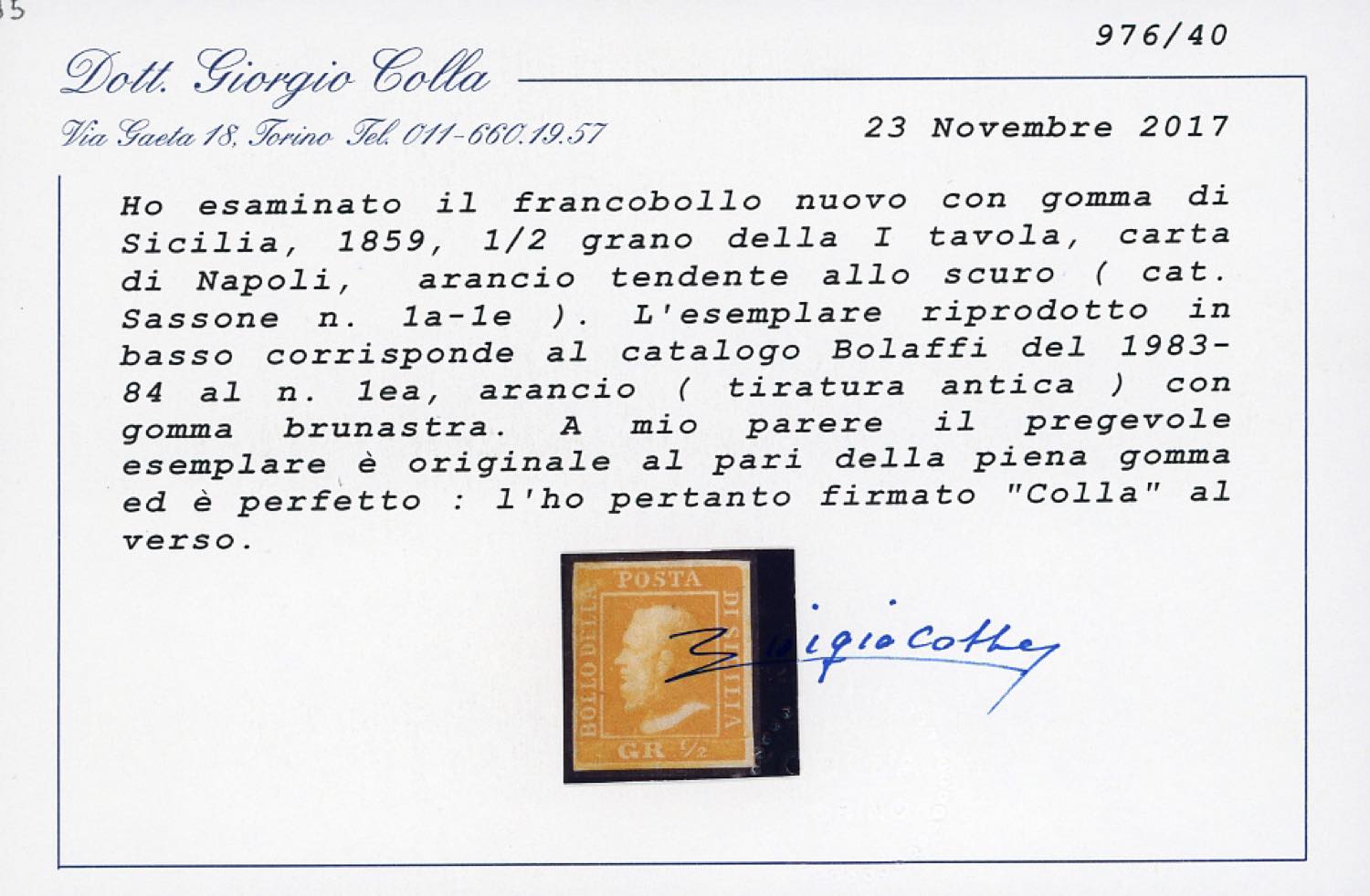 1859 - 1/2 grano arancio tendente allo scuro, tiratura antica, I tavola, carta di Napoli (Sass. 1a/1e, Bolaffi Enciclopedico 1ea), gomma originale, perfetto. Bello. A.Diena, cert. Colla.