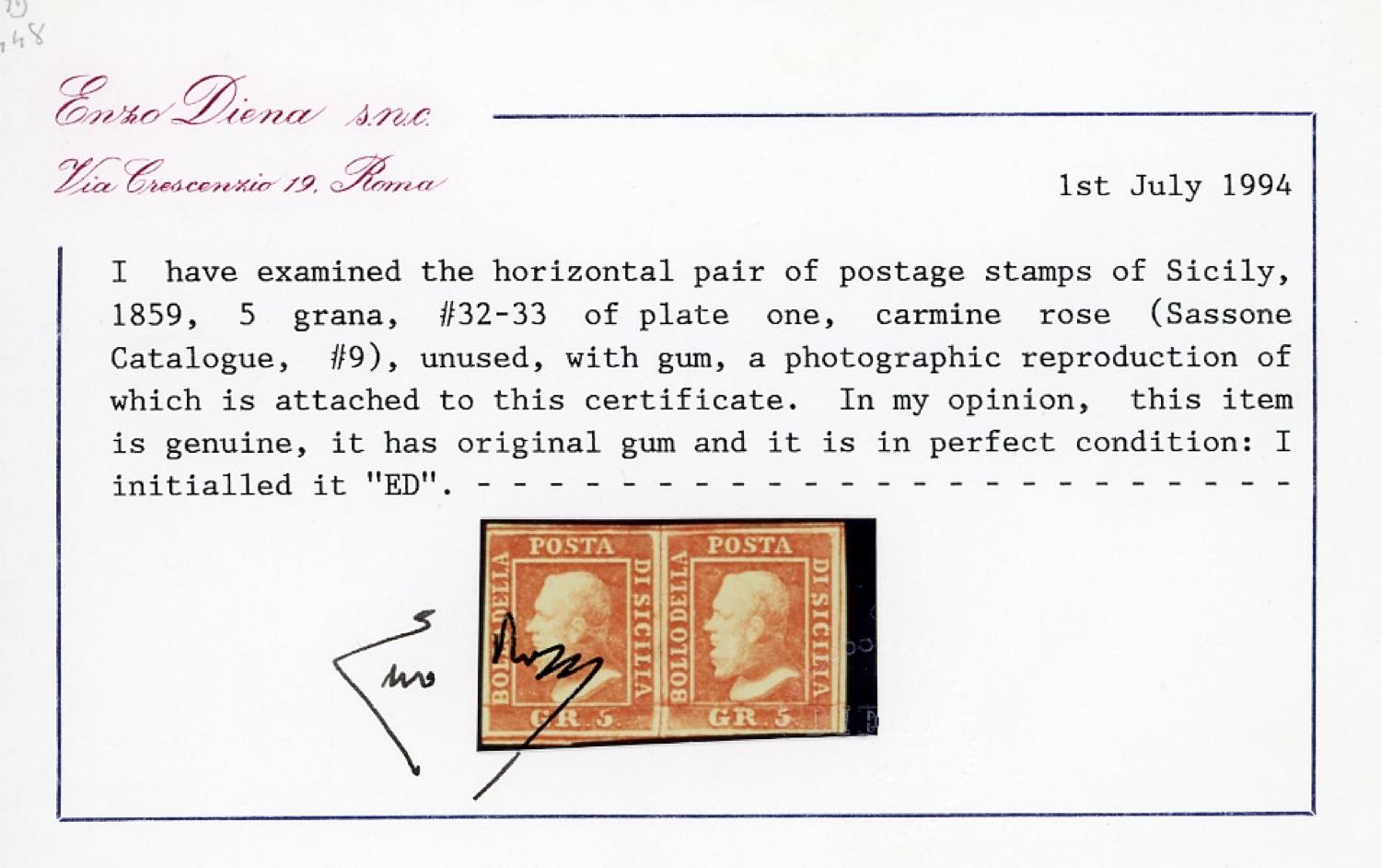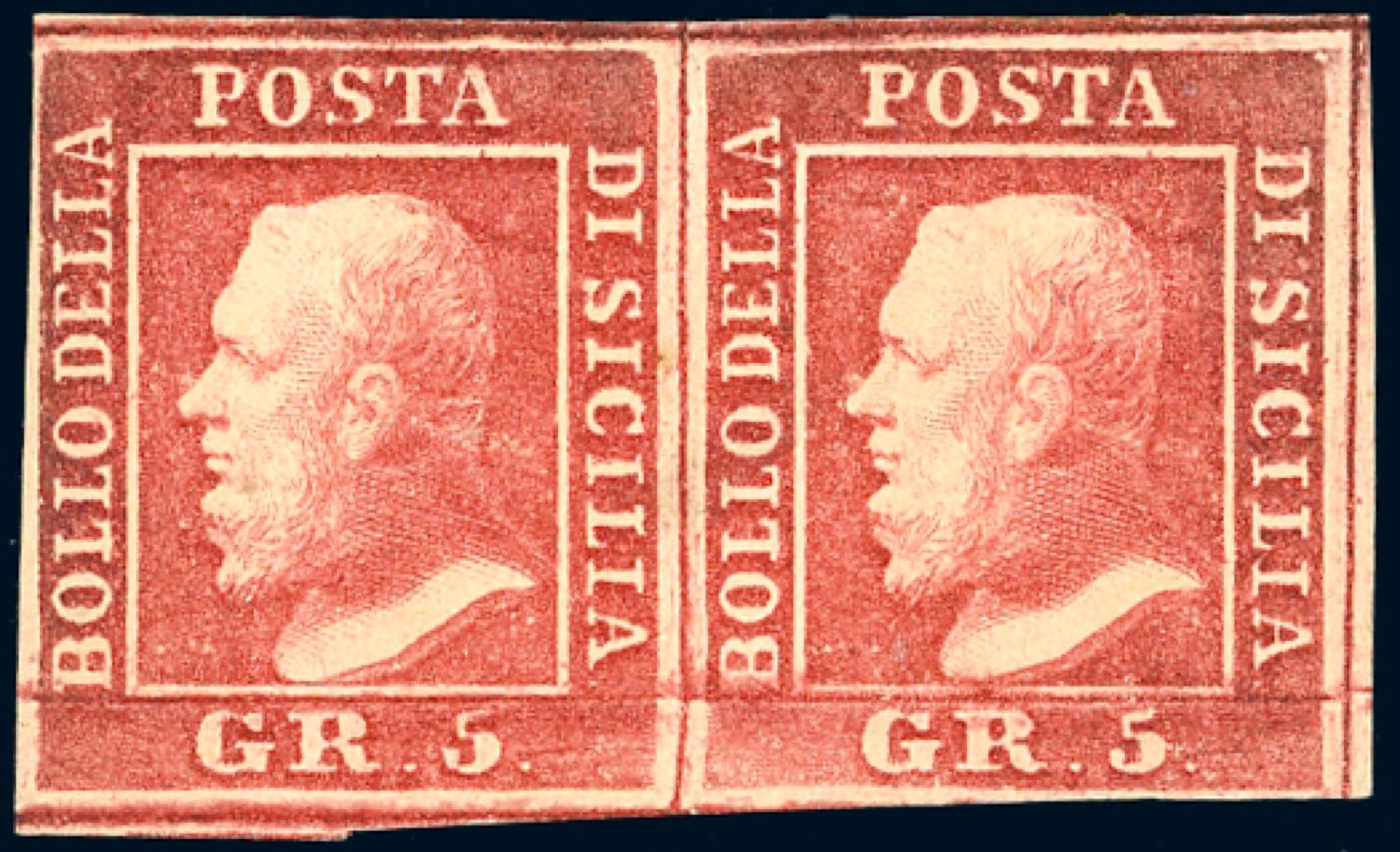 1859 - 5 grana rosa carminio, I tavola (9), coppia orizzontale, pos. 32-33, gomma originale, perfetta. Cert. E.Diena. Ex coll. Rothschild.