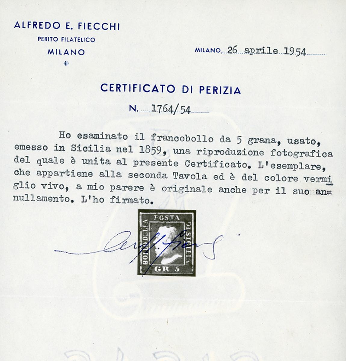 1859 - 5 grana vermiglio vivo, II tavola (11a), usato, perfetto. Molto fresco e ben marginato. Cert. Fiecchi e Ferrario.