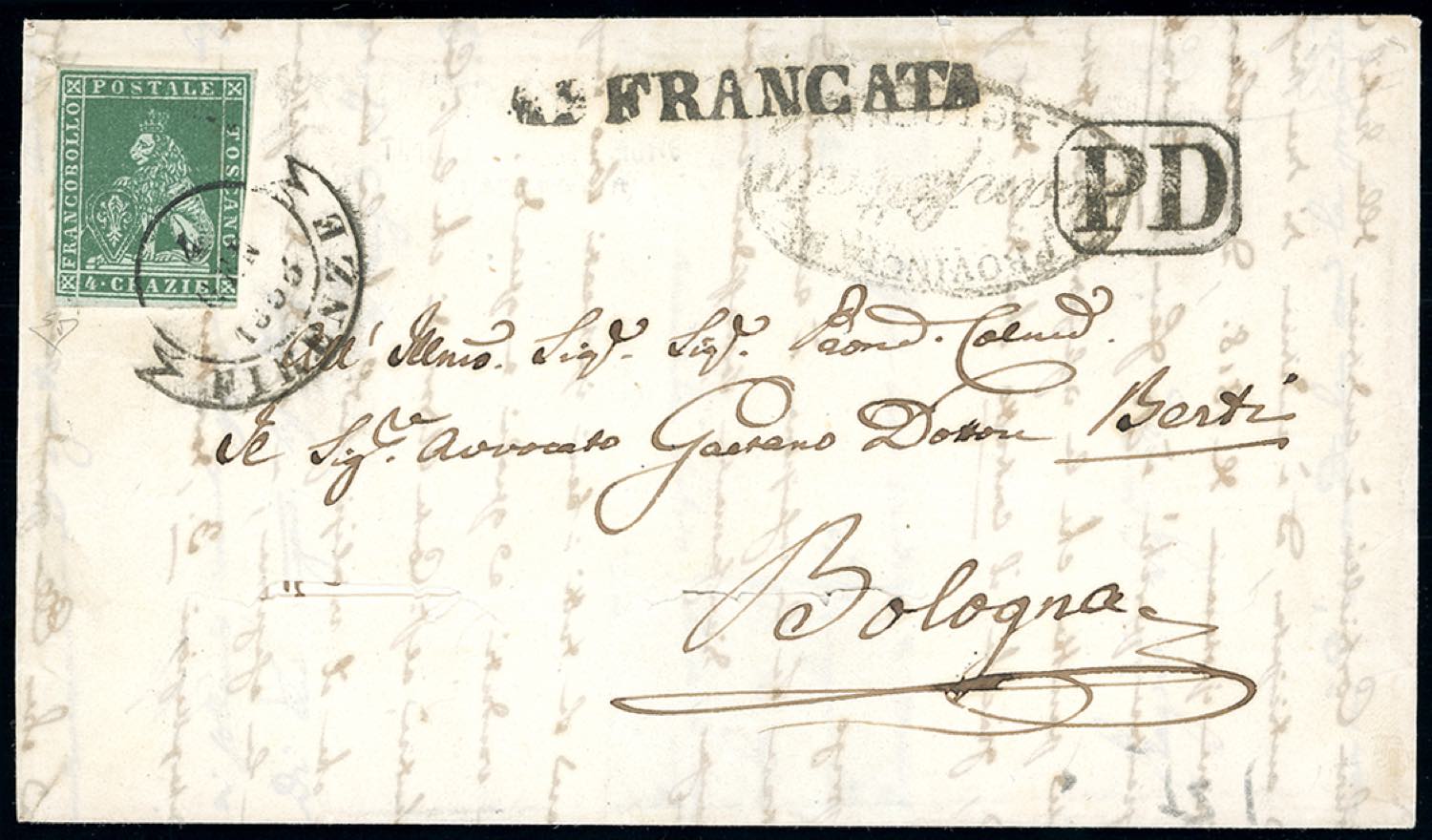 1855 - 4 crazie verde su grigio (6), leggermente intaccato a destra, su lettera da Firenze 4/1/1855 a Bologna, bollo di disinfezione e tagli di rasoio. Interessante. E.Diena. Ex coll. Imperato.