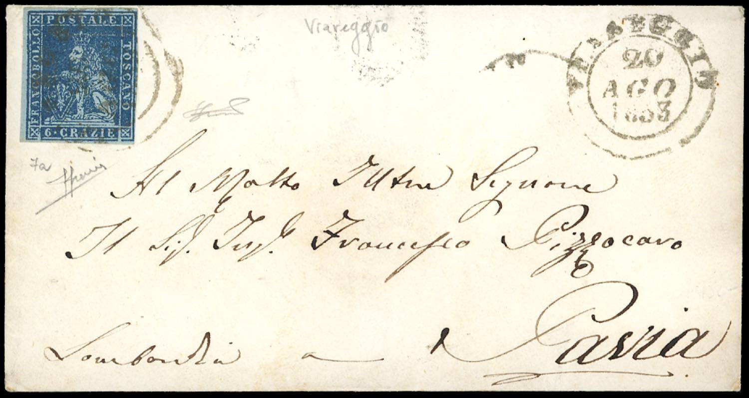1853 - 6 crazie indaco su azzurro (7a), perfetto, su busta da Viareggio 20/8/1853 (punti 7), a Pavia. Bella, molto fresca. Sorani, Ferrario.