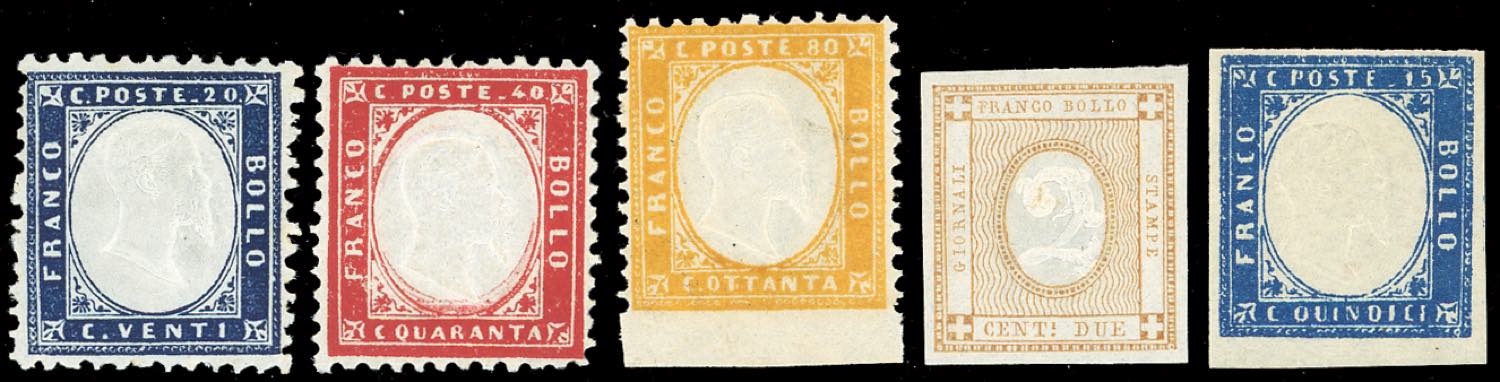 1862/1863 - 20, 40 e 80 cent. dentellati Matraire, 2 cent. giallo e 15 cent. tipo Sardegna (2,3,4,10,11), nuovi, gomma originale integra, perfetti. Ottima qualità. Il 40 cent., ben centrato, cert. E.Diena.