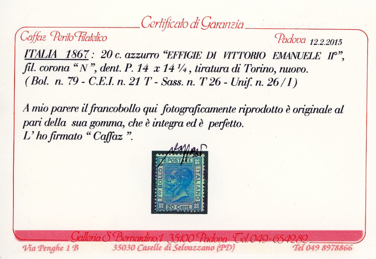 Lotto 456 - 1867 - 20 cent. azzurro, tiratura di Torino (T26), nuovo, ...