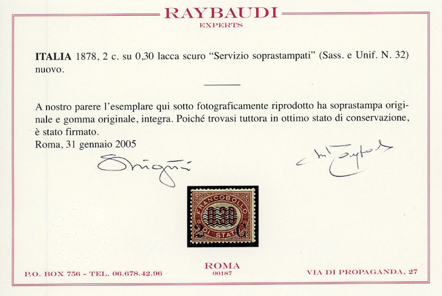 1878 - 20 cent. su 0,30 lire Servizio soprastampati (32), nuovo, gomma originale integra, perfetto, molto fresco. Cert. Raybaudi.