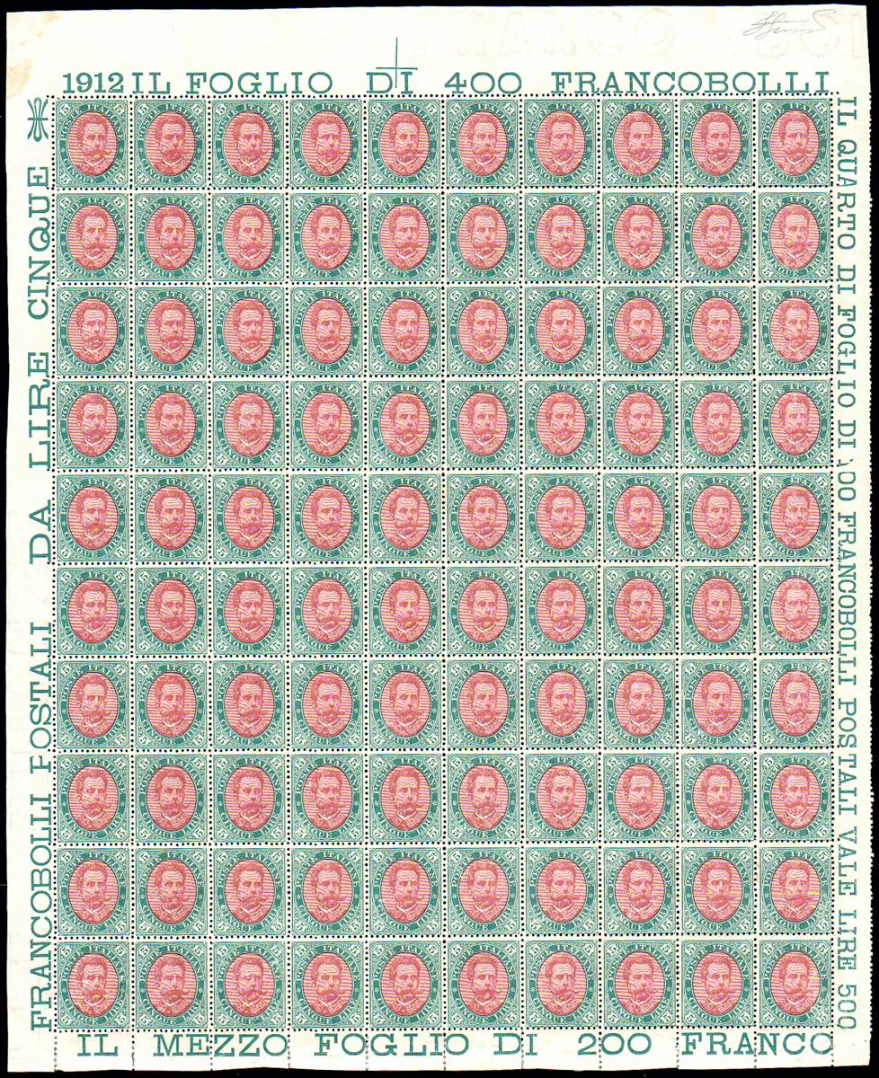 1889 - 5 lire verde e carminio, Umberto I (49), foglio di 100 esemplari con numero di tavola, nuovo, gomma originale integra, perfetto. Bellissimo, notati 20 esemplari ottimamente centrati. Raro. Cert. Ferrario.