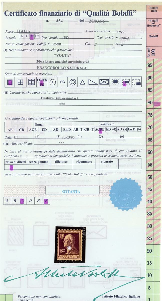 1927 - 20 cent. violetto, anziché carminio, Volta, errore di colore (210A), nuovo, gomma originale integra, perfetto. Raro, tiratura 480 esemplari. Cert. Finanziario Bolaffi 80%.