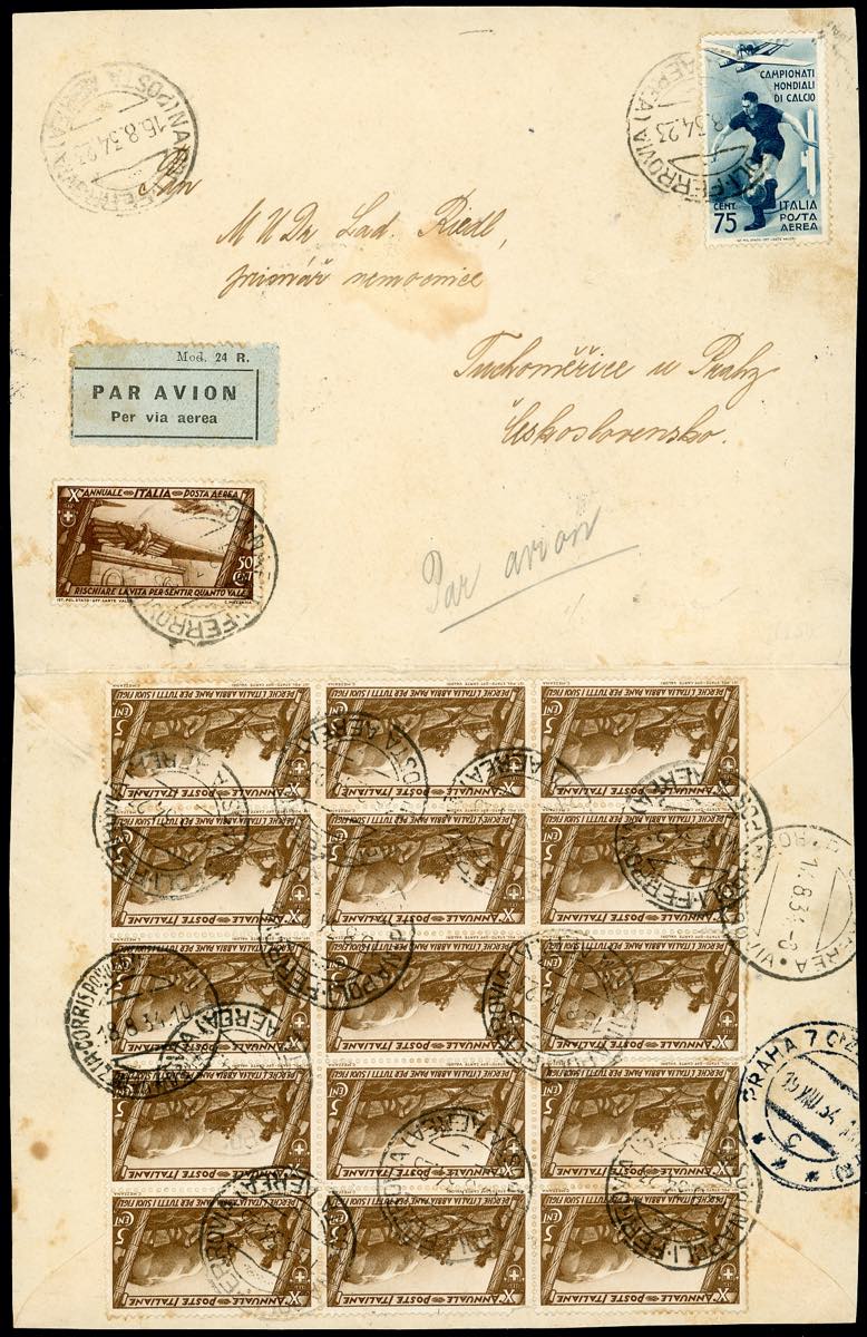 1934 - 50 cent. di posta aerea e 5 cent., blocco di 15, Decennale Marcia su Roma, 75 cent. Mondiali di Calcio posta aerea (235,A42,A70), su aerogramma da Napoli 15/8/1934 a Praga, in Cecoslovacchia, bollo d'arrivo. Bella e rara affrancatura multipla.