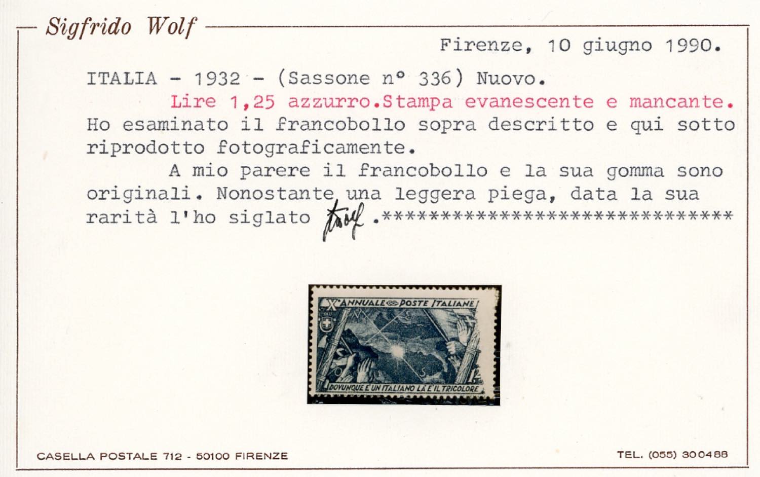 1932 - 1,25 lire Marcia su Roma (336), stampa parzialmente mancante, nuovo, gomma originale, lieve piega. Spettacolare varietà finora inedita e non catalogata. Cert. Wolf.