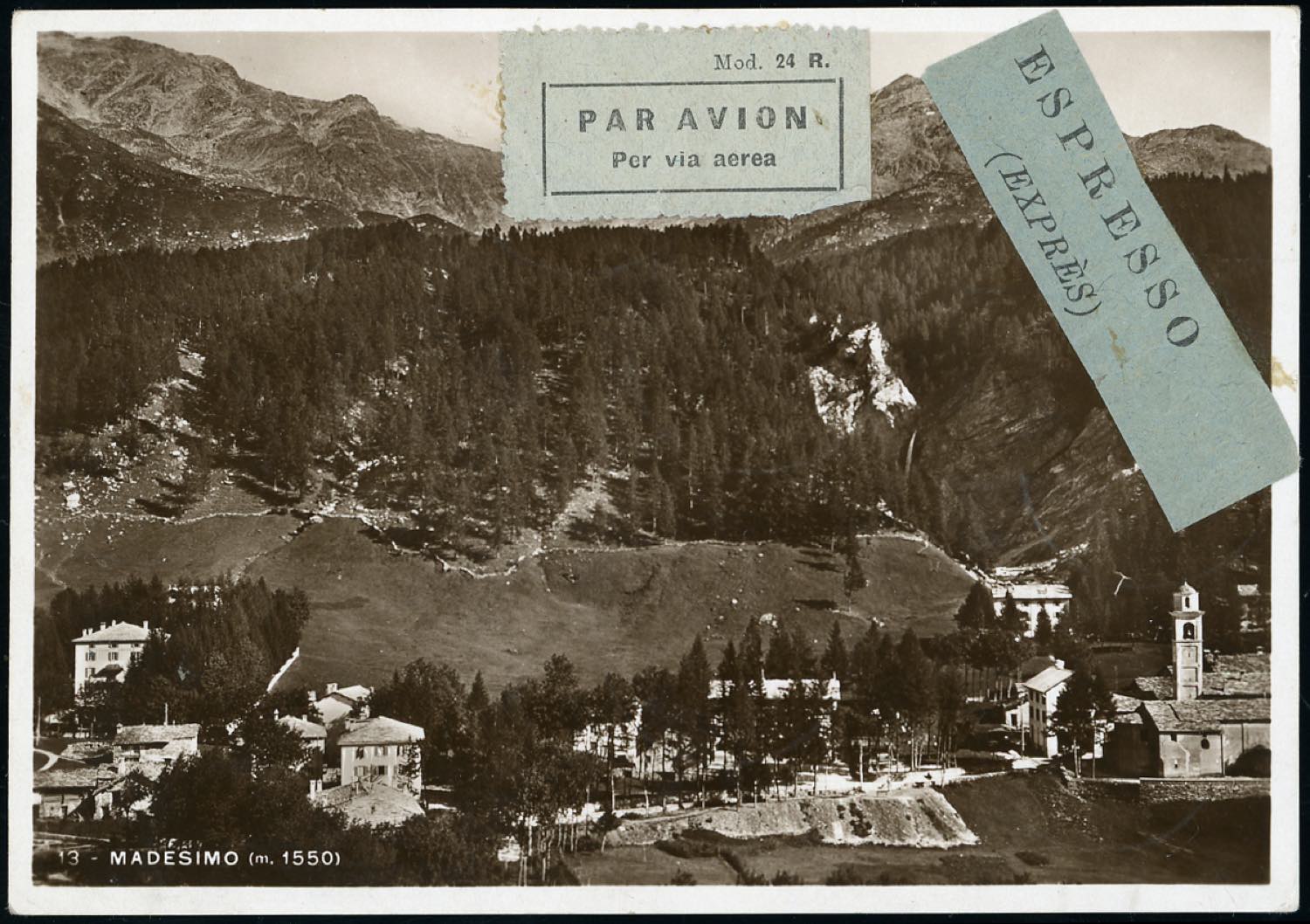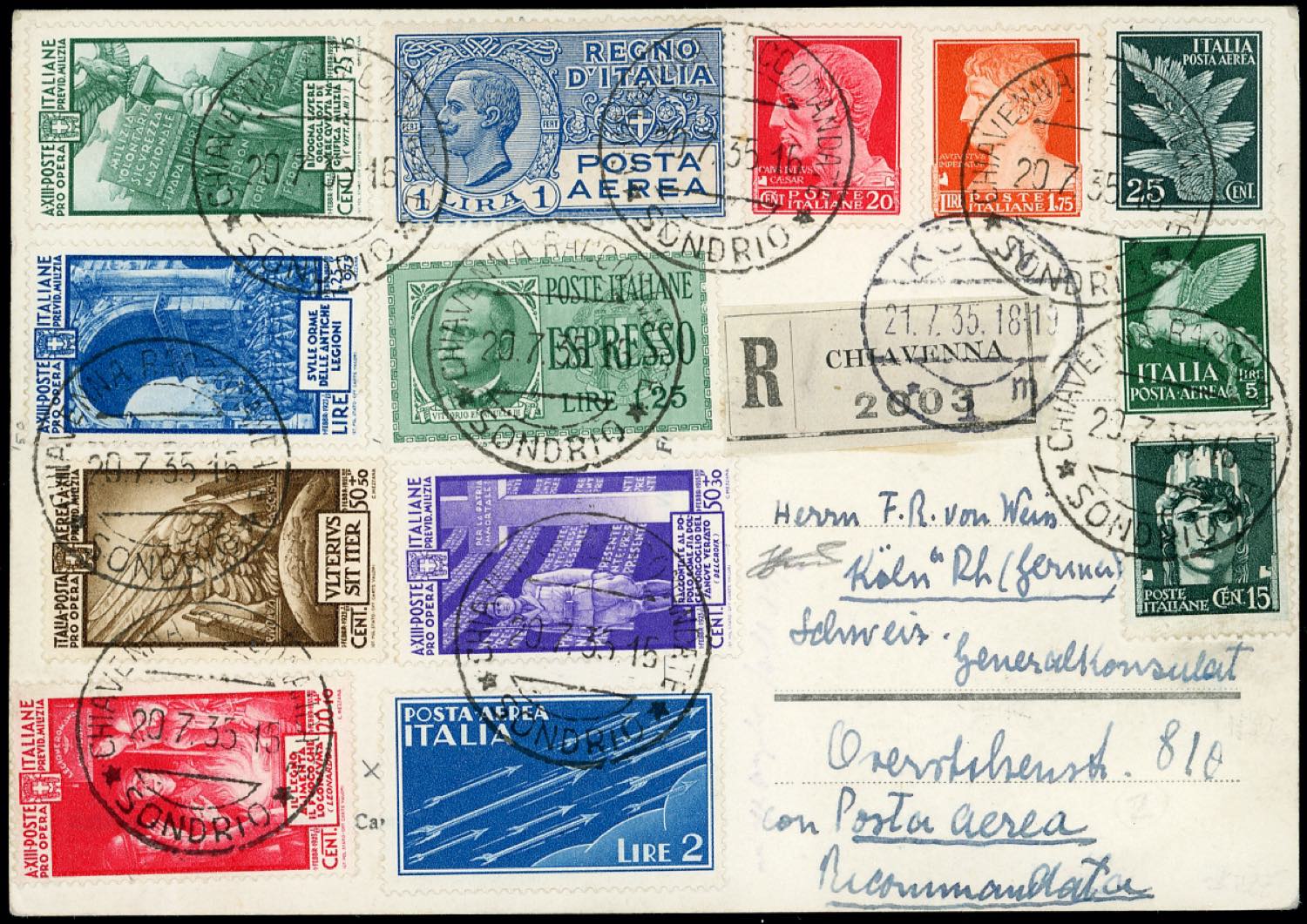 1935 - Milizia IV emissione, serie completa con valori complementari (380/383+A,A10,A15,A16,E15,246,247,254), perfetti, su cartolina espresso raccomandata via aerea da Chiavenna 20/7/1935 a Colonia in Germania, bollo d'arrivo. Bella e d'effetto. Ferrario.
