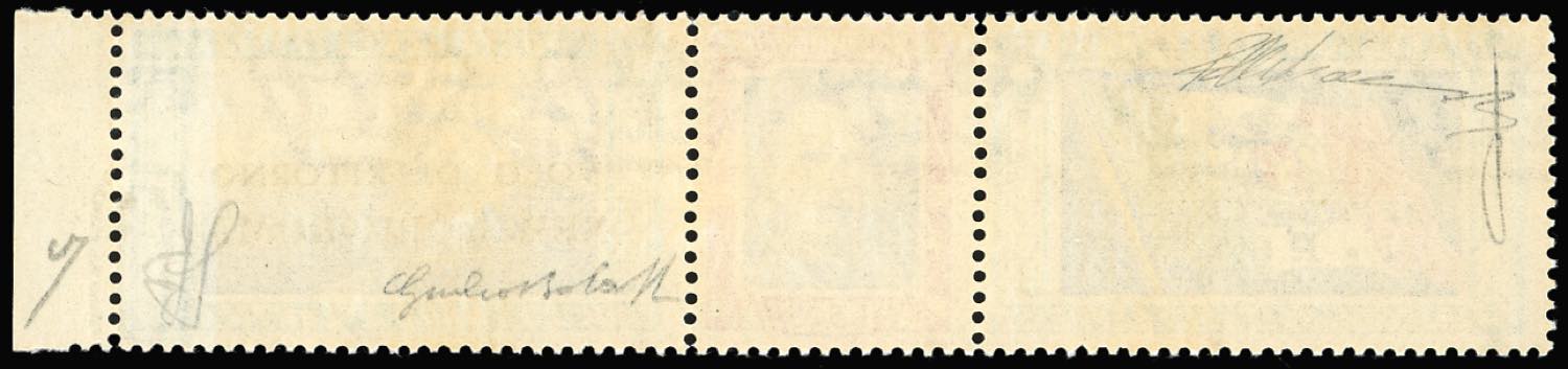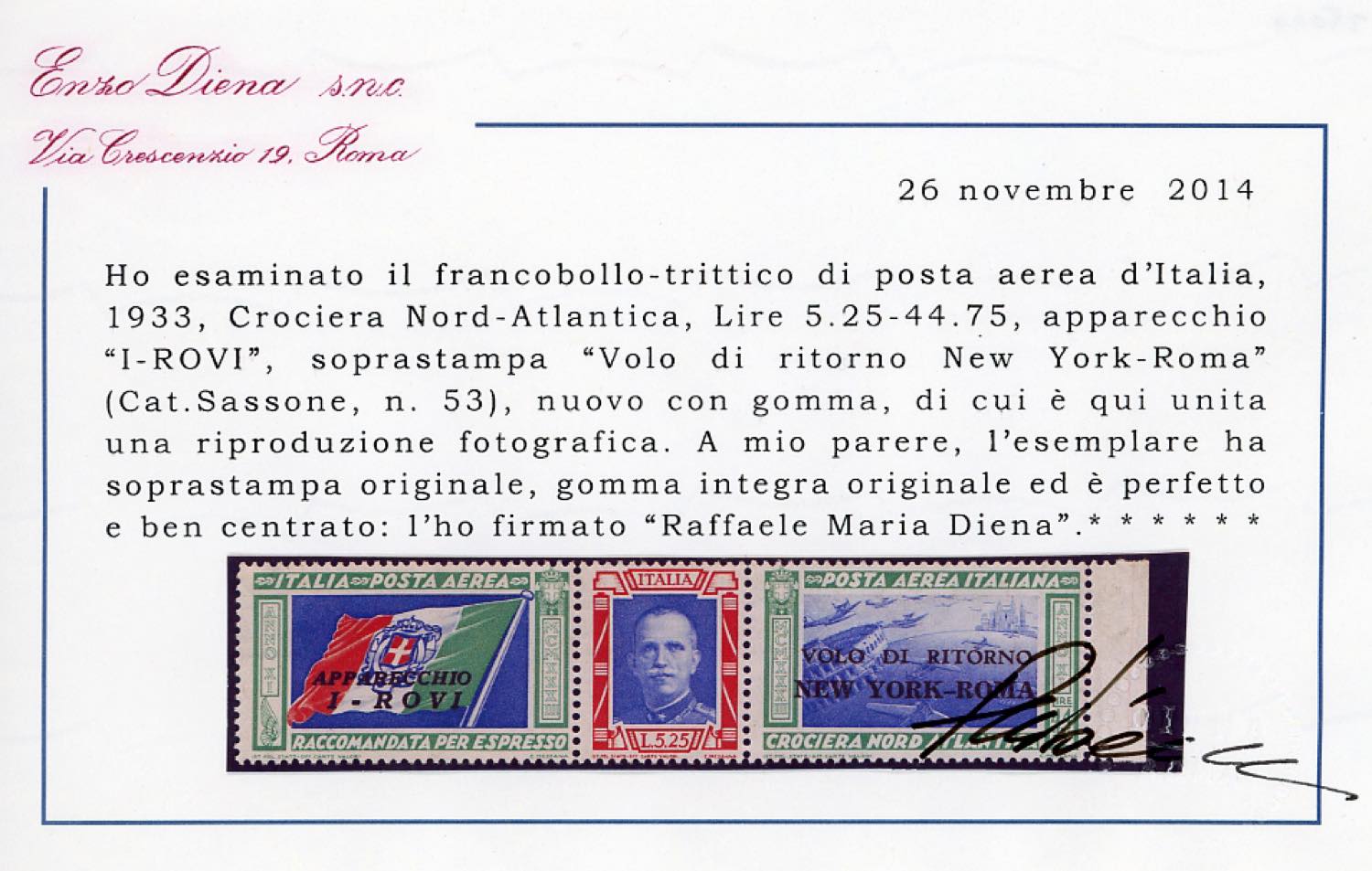 1933 - 5,25 + 44,75 lire trittico I-ROVI, soprastampato "VOLO DI RITORNO", (53), bordo di foglio, gomma originale integra, perfetto. Con questa sigla sono stati soprastampati solo 25 esemplari. Rarità del Regno d'Italia. G.Bolaffi, cert. Alberto e Raffaele Diena.