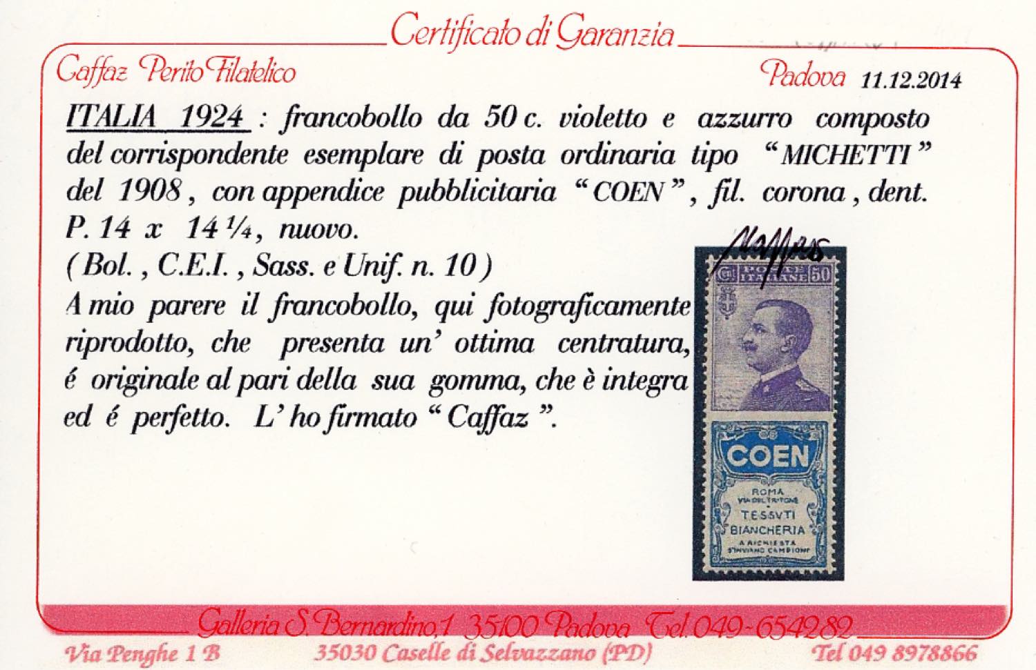 1924 - 50 cent. Coen (10), nuovo, gomma originale integra, perfetto e ben centrato. Ottima qualità. Cert. Caffaz.