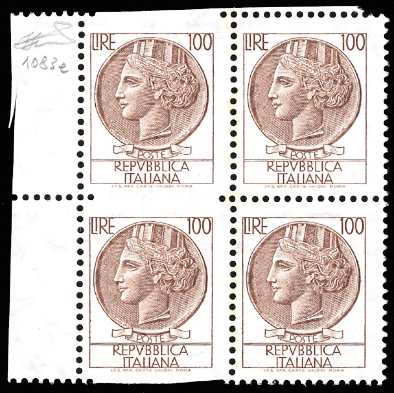 1968 - 100 lire bruno Siracusana, blocco di quattro con i primi due esemplari non dentellati orizzontalmente (1083e), nuovo, gomma originale integra, perfetto. Molto raro. G.Colla, Ferrario.