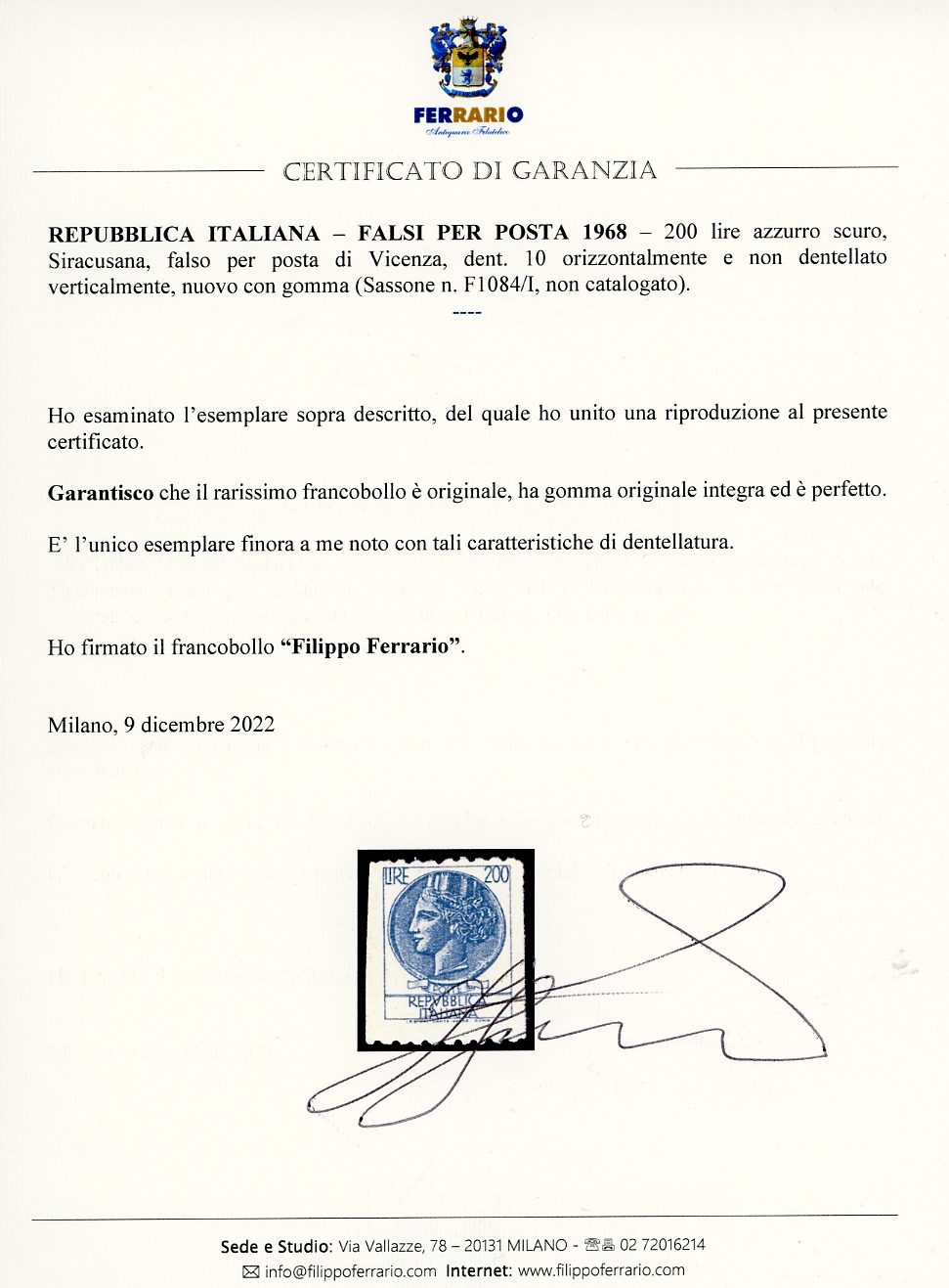 1968 - 200 lire Siracusana, FALSO PER POSTA di Vicenza, dent. 10 orizzontalmente e non dentellato verticalmente (F1084/I, non catalogato), nuovo, gomma originale integra. Rarissimo. E' l'unico esemplare finora a noi noto con tali caratteristiche di dentellatura. Sorani, cert. Ferrario.