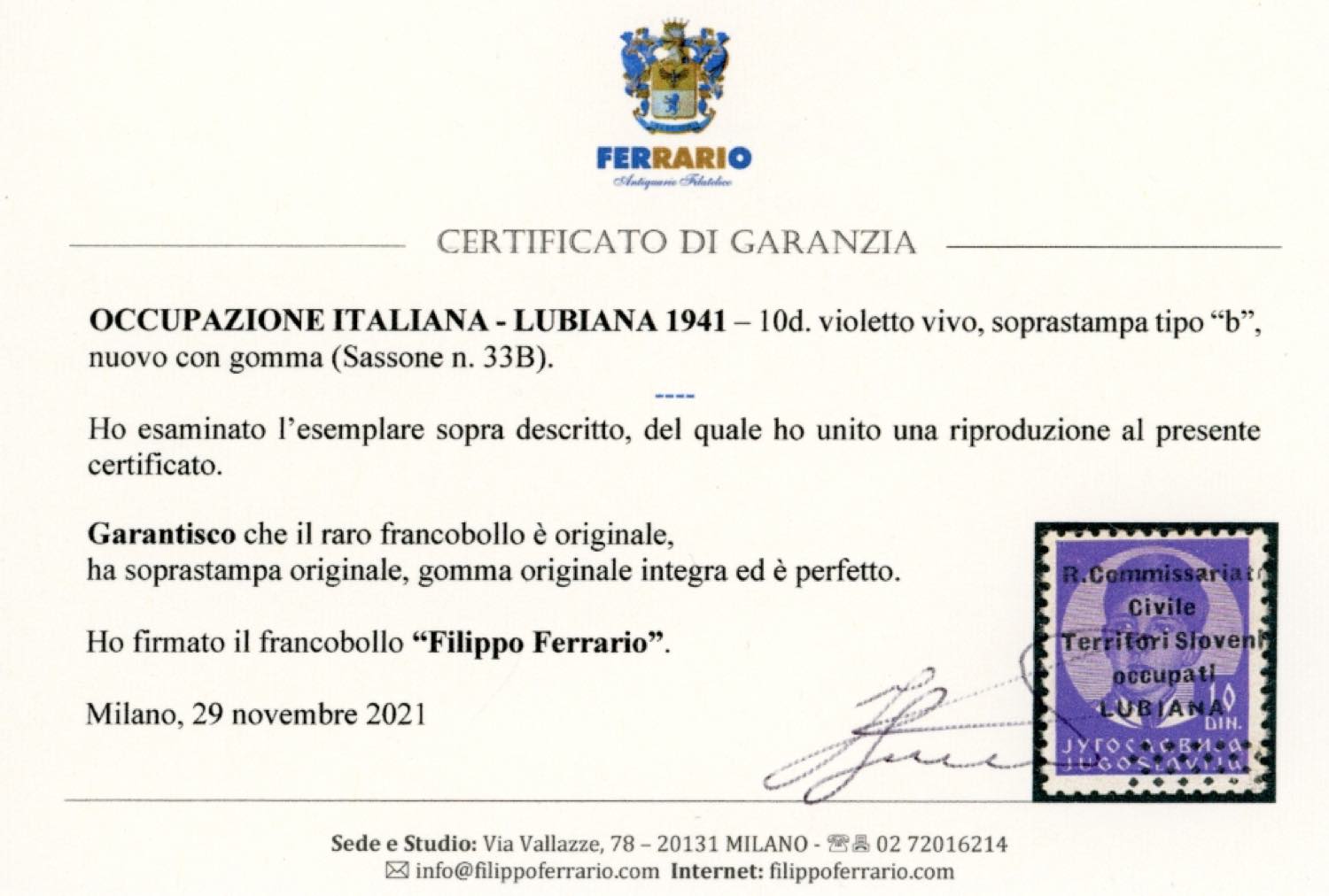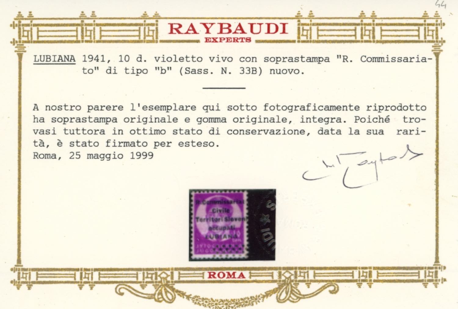 LUBIANA 1941 - 10 d. soprastampa di tipo "b" (33B), gomma integra, perfetto. Splendido e raro! A.Diena, cert. Oro Raybaudi e Ferrario.