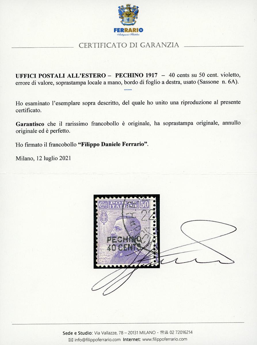 PECHINO 1917 - 40 cent. su 50 cent., errore di valore (6A), usato, perfetto. Molto raro e di ottima qualità. E.Diena, cert. Diena e Ferrario.