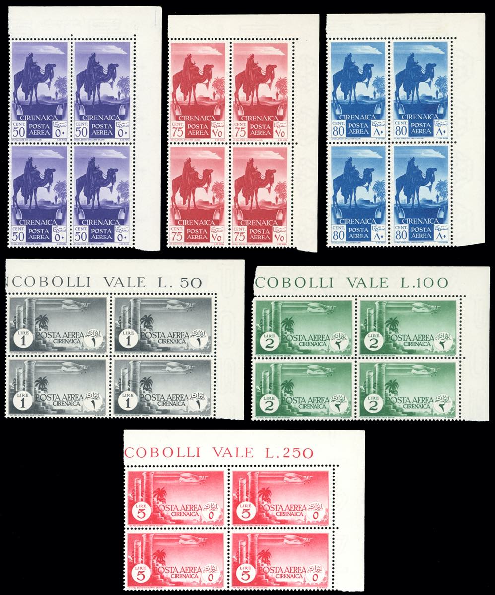 POSTA AEREA 1932 - Soggetti africani, serie completa (6/11), blocchi di quattro, angolo di foglio, gomma originale integra, leggermente brunita per alcuni esemplari, perfetti.