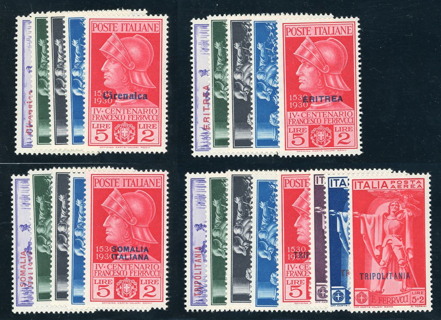 1930 - Ferrucci, giro completo delle quattro colonie (Cirenaica 63/67,Eritrea 165/169,Somalia 133/137,Tripolitania 64/68+A), gomma originale integra, perfetti e di ottima qualità.