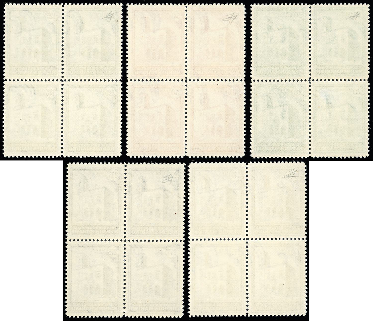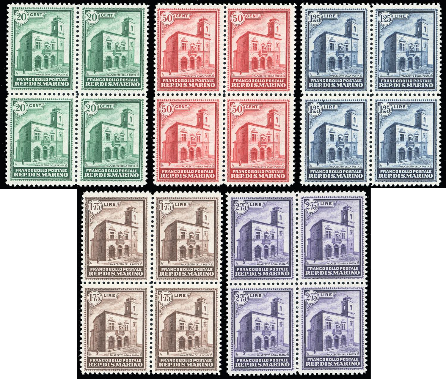 1932 - Palazzetto della Posta, serie completa (159/163), blocchi di quattro, gomma originale integra, perfetti e di ottima qualità. Splendidi. Molto rari in quartina. Cert. Ferrario.